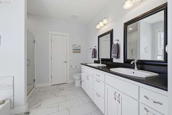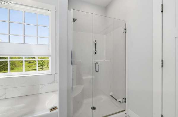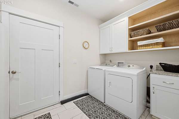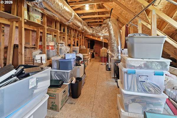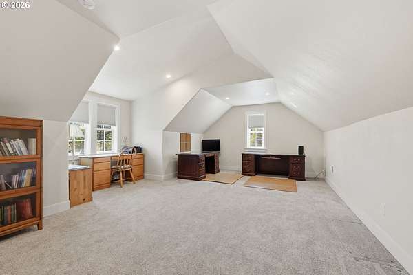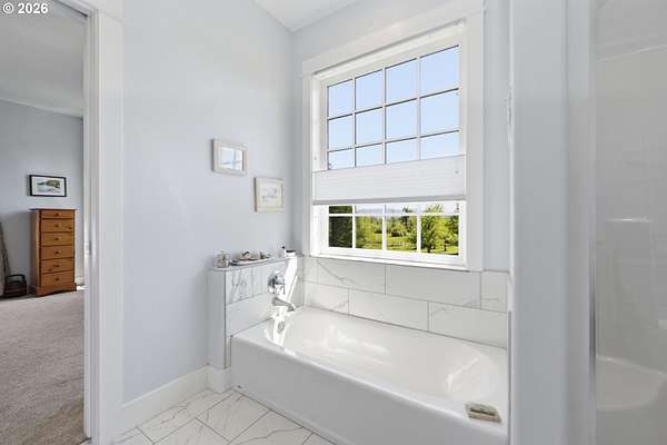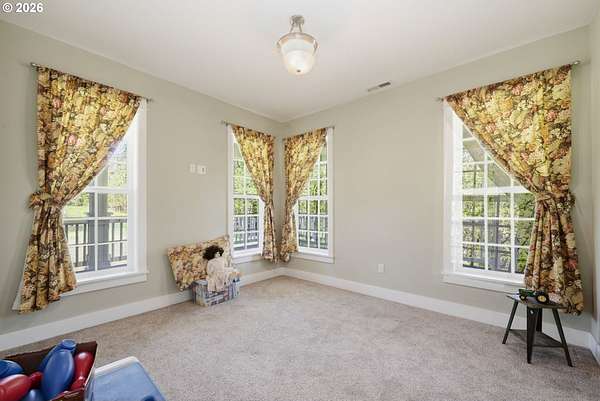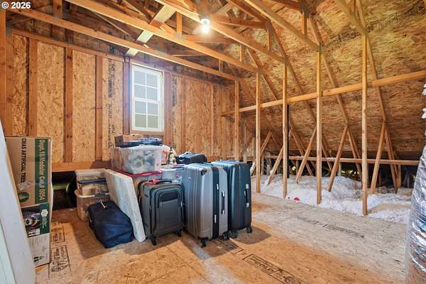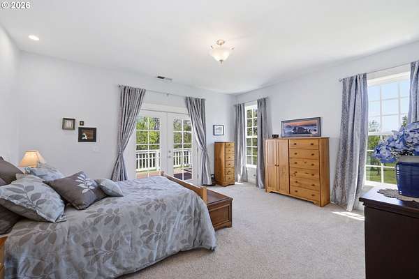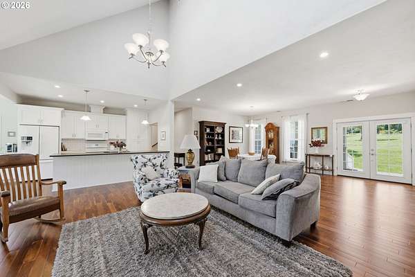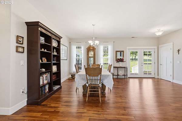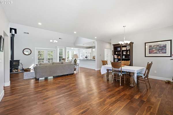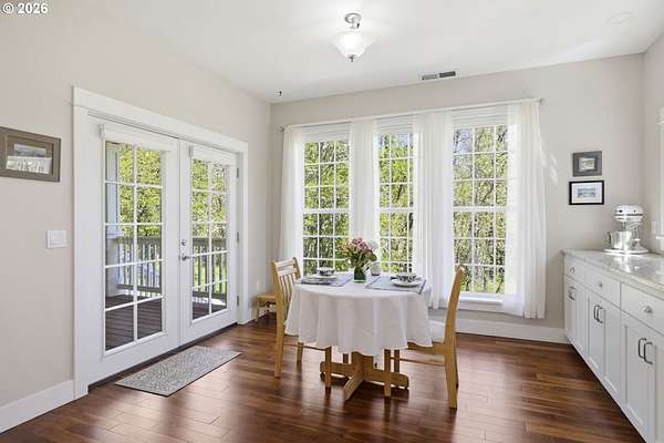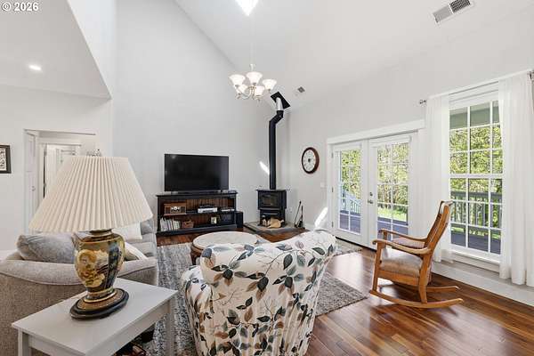 Stunning Modern Farmhouse features a classic wrap-around porch and light-filled interior. Mostly main-level living showcases exquisite acacia wood flooring, complemented by detailed molding on abundant windows and doors. The thoughtfully designed floor plan offers excellent separation between the guest rooms and the primary suite. The gourmet kitchen features a leathered granite peninsula, extra deep farm sink, timeless subway tile backsplash, and a convenient pantry with pull-out shelves. Adjacent to the kitchen, the bright breakfast room catches the morning sun and includes soft-close cabinetry, an extended granite counter, hill views, and French doors for easy outdoor access. The generous family room adds drama with a vaulted ceiling, skylights, tall windows, French doors, and woodstove. The Primary suite boasts a separate bathtub and shower, dual sinks, walk-in closet with built-ins, and French doors leading to its own deck with views of the nearby creek and hills. Each of the 2 1/2 bathrooms and the laundry room have porcelain tile flooring and granite counters. Up the wide staircase, enjoy the very private den/office which could easily function as a large 4th bedroom, if a closet was added. The 466 square foot unfinished stand-up attic offers wonderful storage and/or expansion possibilities. Architectural amenities include an Arched Window, Front Shutters, Attached Flower Boxes, Mature Landscaping, Fruit Trees, and a Fenced Garden. Walk-in storage space, approximately 40'x 11' under the home, has electricity, plywood "floor", small shop space, and insulation. There is even more storage space under the side and back of the wrap-around decks. Additional abutting 5.44-acre parcel, Ridgetop Lot 15, RMLS #24641325, is available, for a total of more than 11 acres. Don't miss this opportunity to experience life in a truly beautiful home in one of South Eugene's premier neighborhoods! Contact your broker today to view.