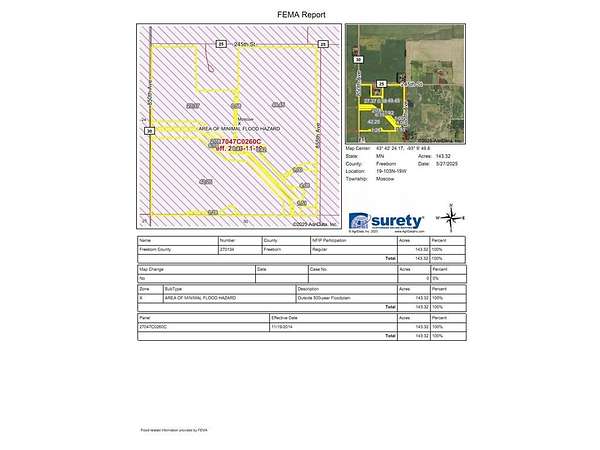 The listing company is honored to offer the Mary Price Trust Farm for sale. The farm is located in the Southwest 1/4 of Section 19 Moscow Township, in Freeborn County, Minnesota. The property consists of one parcel of 149.47 +/- deeded acres with 123.15 +/- acres of tillable cropland with excellent quality soils with an average Crop Productivity Index (CPI) of 91.4. There is a total of 12.6 CRP acres with yearly income and 7.57 +/- ditch/waterway acres. The topography of this parcel is level to gently rolling. Immediate access to the farm is on the north via 245th Street and on the west via 850th Avenue. State Highway 251, Interstate 90 & 35 make transportation routes highly accessible.
