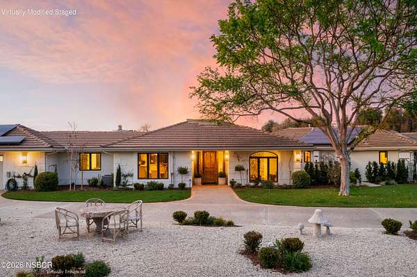 Luxury Wine Country Living on Adobe Creek in SolvangExperience the perfect blend of privacy, convenience, and luxury in this stunning Solvang estate, nestled along a cul-de-sac on Adobe Creek. Designed with outdoor entertaining in mind, this thoughtfully crafted home offers beautiful mountain views as its centerpiece.The newly built outdoor space is a true entertainer's dream, featuring a spacious sand-set limestone patio, an outdoor grilling station complete with a Sunterra stainless steel Santa Maria-style BBQ, a DCS gas grill, and a bar area with countertops--all finished with a Santa Barbara smooth concrete texture.Lush, newly designed landscaping enhances the beauty of this property, with mature olive trees, kumquat trees, manicured boxwoods, native grasses, and vibrant lawns. As the sun sets, gather around the custom limestone firepit in the courtyard patio, overlooking the terraced grounds that lead to the arena, tack room, and pastures--an equestrian's paradise.Inside, the home features four spacious bedrooms plus an office with a closet, providing versatility for work or additional guest space. The kitchen boasts brand-new stainless-steel appliances, while the oversized laundry room offers the perfect setup for a coffee station or pantry overflow.A generous three-car garage and expansive driveway provide ample parking for vehicles and trailers. Dual heating & air conditioning + Solar. This exceptional property is a rare find--