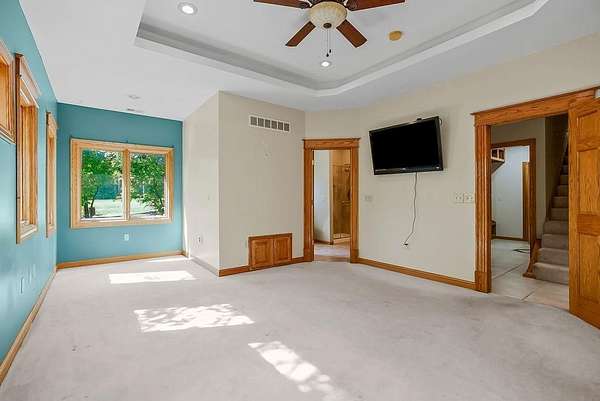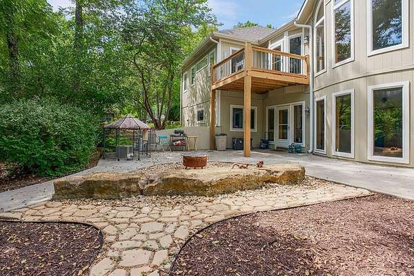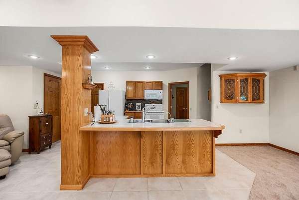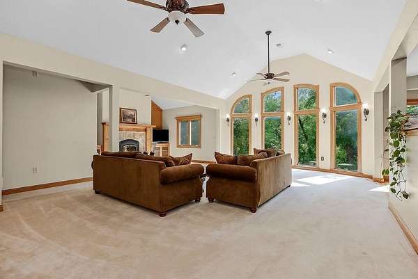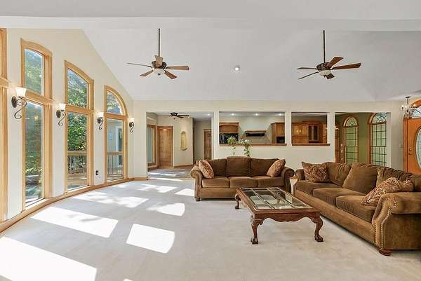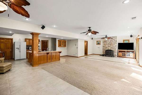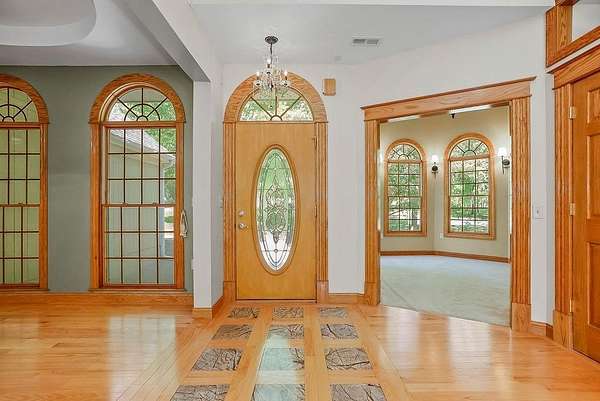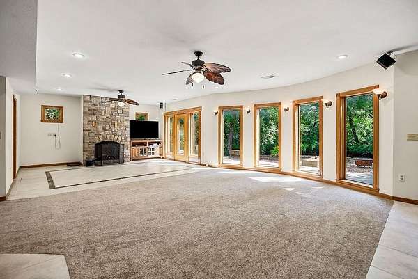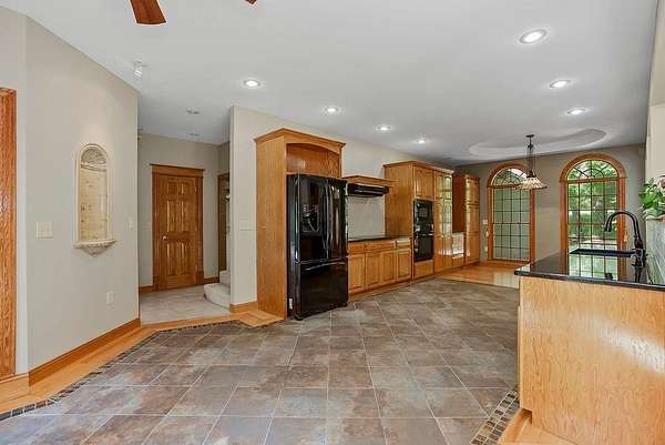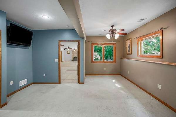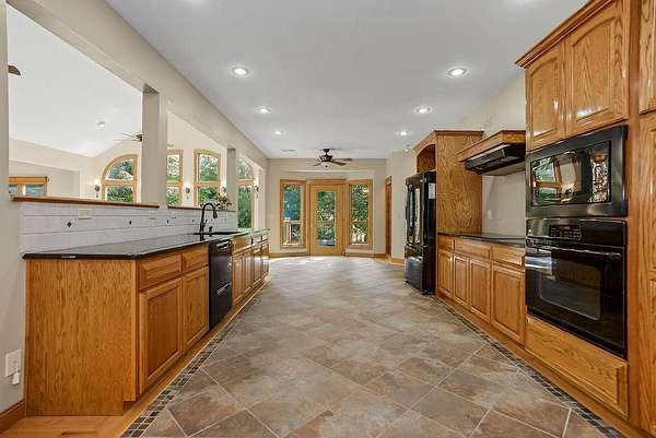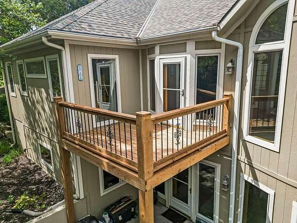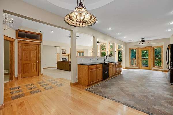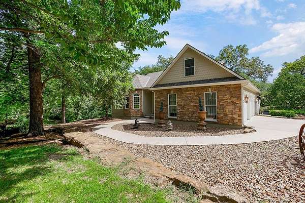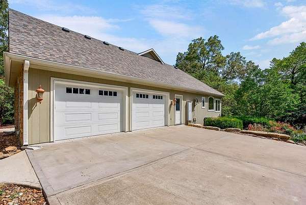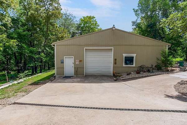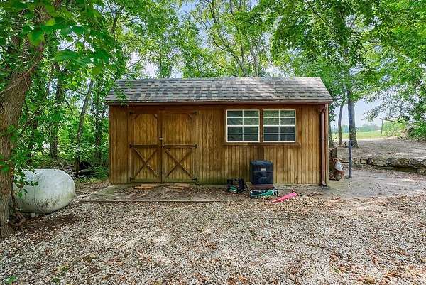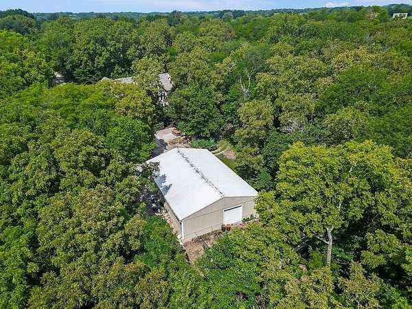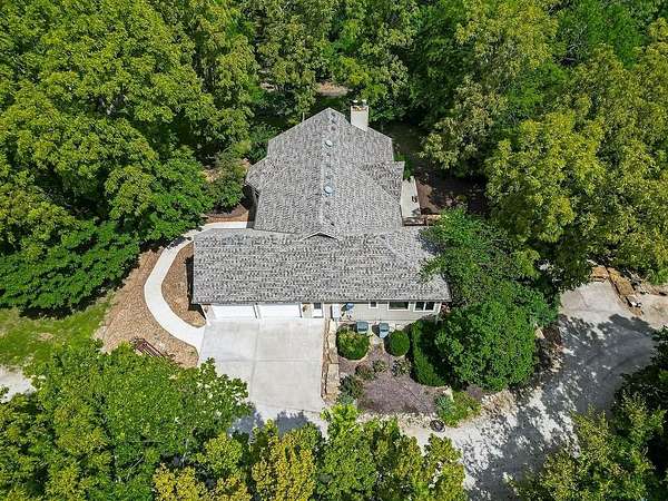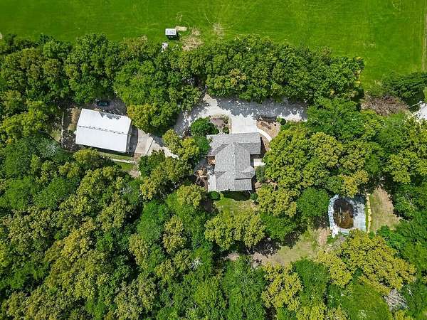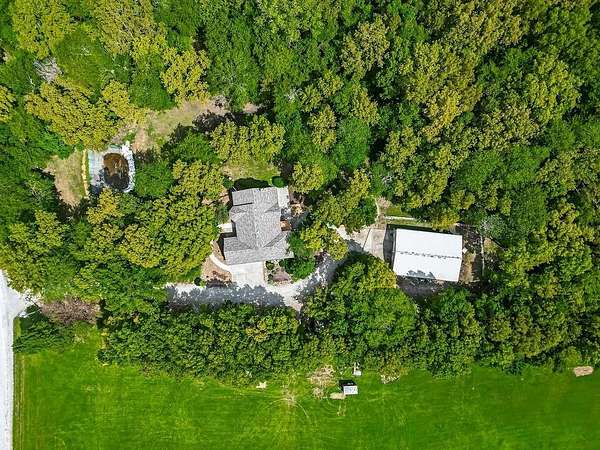 Your Country Dream Awaits! Experience peaceful country living on approx 7.75 acres of lush grass and wooded beauty! BRAND NEW ROOF!!! Designed with large families in mind, this custom-built home offers two complete living spaces--one on the main level and another in the finished walkout basement. The main floor is filled with natural light and features hardwood and tile floors that flow seamlessly throughout. The custom kitchen offers pull-out drawers, decorative fixtures, and stylish niches, while the stunning home office boasts soaring ceilings and Palladian windows. The primary suite includes a private bath, walk-in closet, and tiled shower, and a second bedroom on the main level features its own full bath with a tub. Upstairs, a third bedroom with vaulted ceilings provides a cozy retreat. Laundry/mud room and a half bath with raised vessel sink also on the main floor. The finished walkout basement adds even more living space and lots of light with a full kitchen and island, family room, two additional bedrooms, a storm shelter, and 1.1 baths. This home is wheelchair accessible, featuring an oversized roll-in shower in the primary lower-level bath, and an elevator shaft is already in place--wired and reinforced for future installation. Step outside to a peaceful setting surrounded by mature trees, providing shade and relaxation on the back patio. The property also features a spacious 40' x 60' outbuilding with electricity and a bath stub-out, plus an additional 10' x 20' storage shed for all your needs. On the south side, you'll find a wide open grass field--perfect for recreation, gardening, or simply enjoying the extra space. The sale includes two parcels, aerial provided. Shown by appointment only, this property combines space, functionality, and country charm in one perfect package!