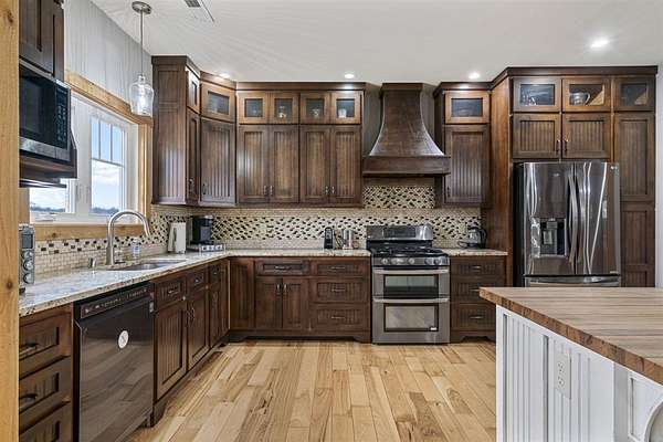 - Covered Deck, Covered Front Porch, Covered Patio, Fence, Landscaping, Mature Trees, Partial, Pond(s)
