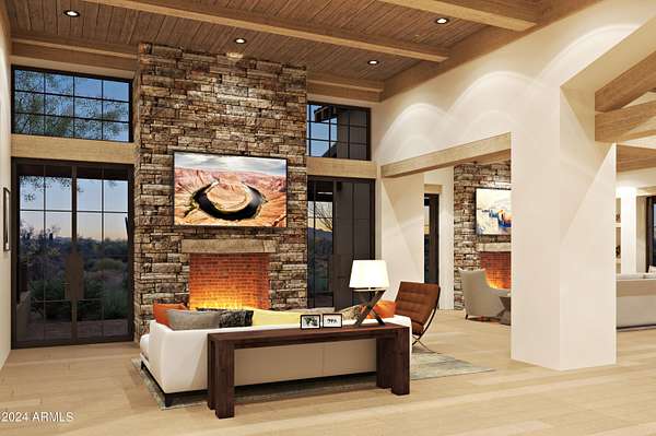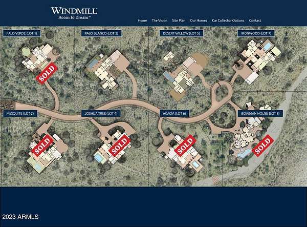 This 5,867/sf ''Palo Blanco'' Ranch Hacienda style home is currently being constructed on 2.17 acres of beautiful Sonoran desert within the private and gated 8 home enclave of Windmill. The luxurious home is all on one level with an open floor plan with great room, dining, living and sitting rooms, 4 bedroom en-stuites , den/office, 5.5 baths, fitness room and a 4 car garage. It is filled with high end features including 3 fireplaces, gourmet center island kitchen with Subzero and Wolf appliances and two dishwashers, Butler's pantry, covered patios, covered patios, courtyards, water & fire features, negative edge pool with spa and BBQ. Lots 5 and 7 are also available with soon to come custom homes.