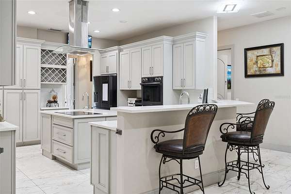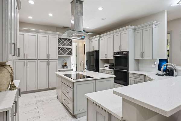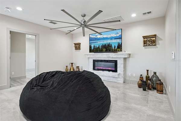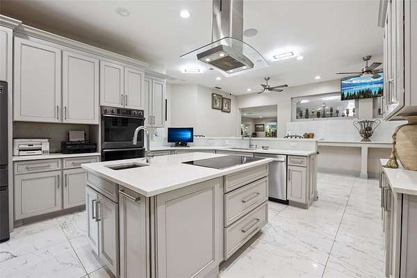 Inside, enjoy a spacious open floor plan filled with natural light, designer lighting, and seamless indoor-outdoor living. The chef's kitchen features quartz countertops, breakfast bar, Samsung cooktop, double oven, and tall cabinetry. A convenient flex room adjacent to the kitchen is perfect for a gym or office, plus a full bath and laundry room nearby.
