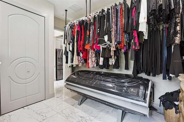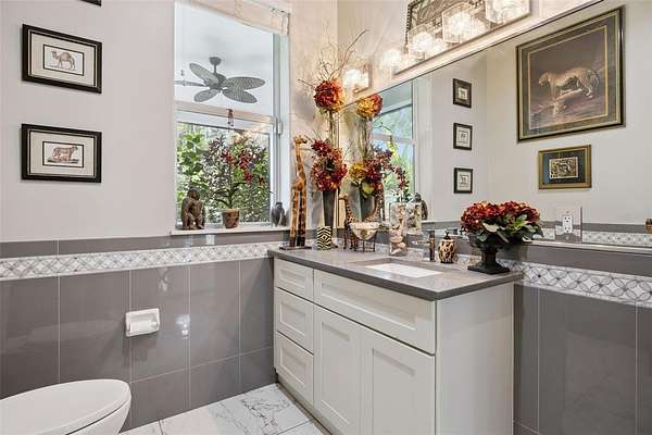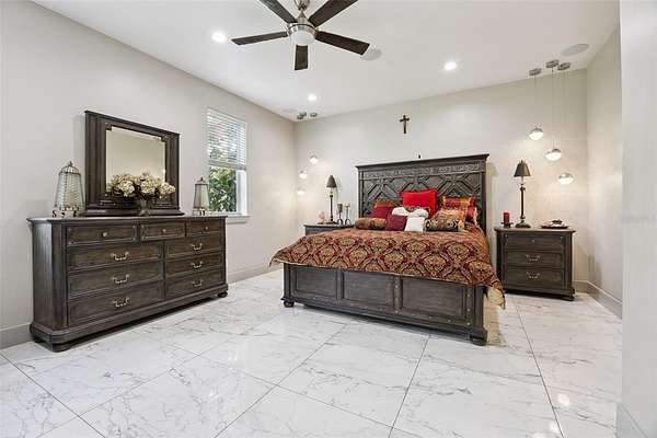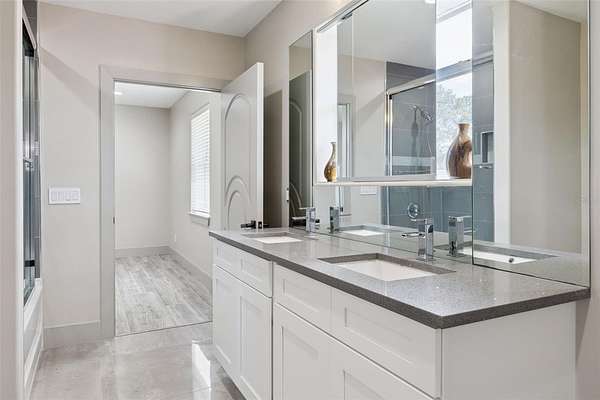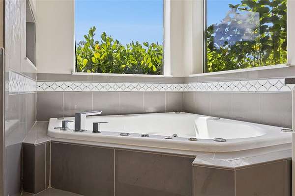 The primary suite features dual walk-in closets, double vanities, a large walk-in shower, and a corner Jacuzzi tub framed by picture windows. An additional bedroom is located on the main level for convenience.
