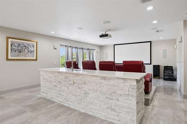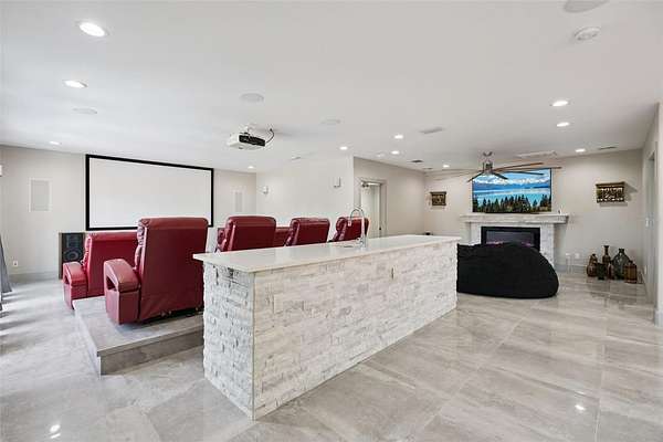 Upstairs includes two bedrooms with a shared Jack & Jill bath, a media/game room, theater with fireplace, and a spacious balcony overlooking the front of the property.