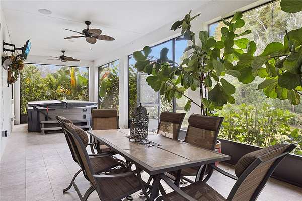 Interior finishes include luxury vinyl plank flooring and porcelain tile throughout. Screened porches at the front and rear provide perfect spaces to relax, with a hot tub on the rear porch included.