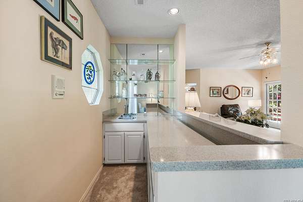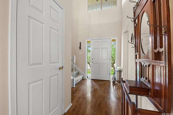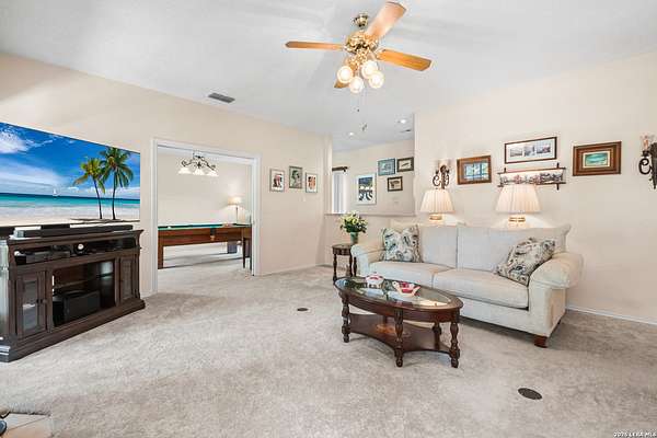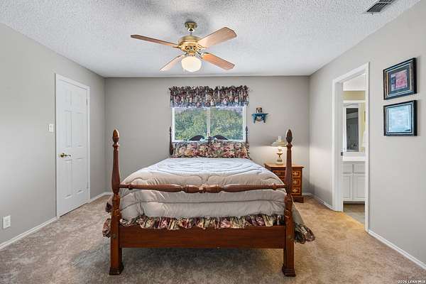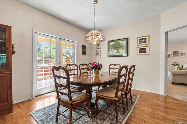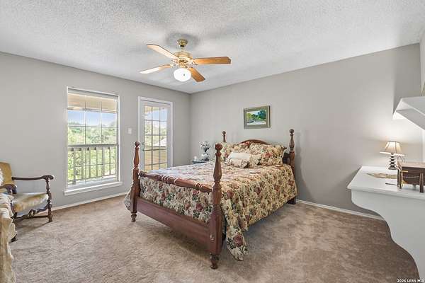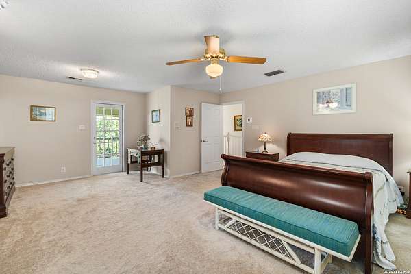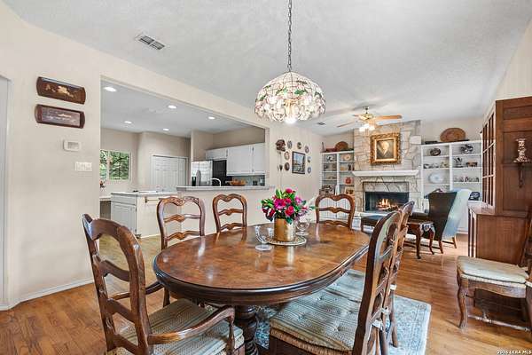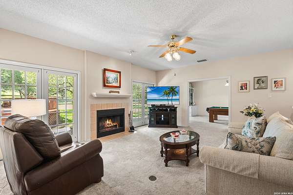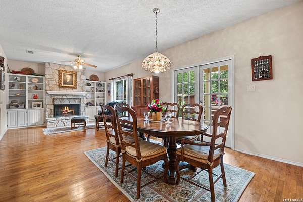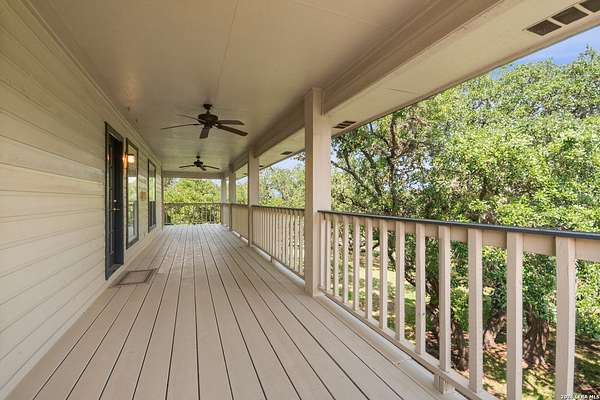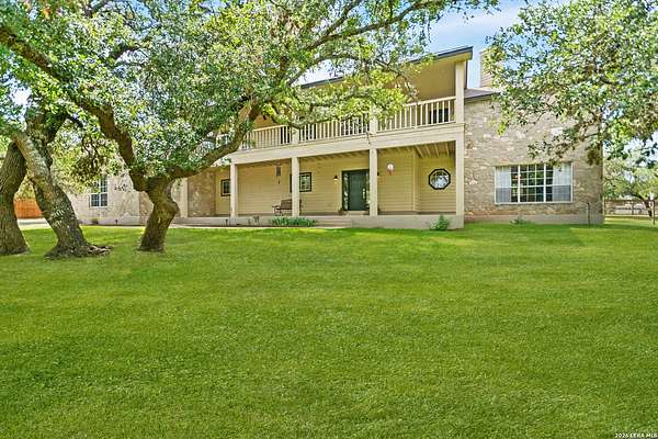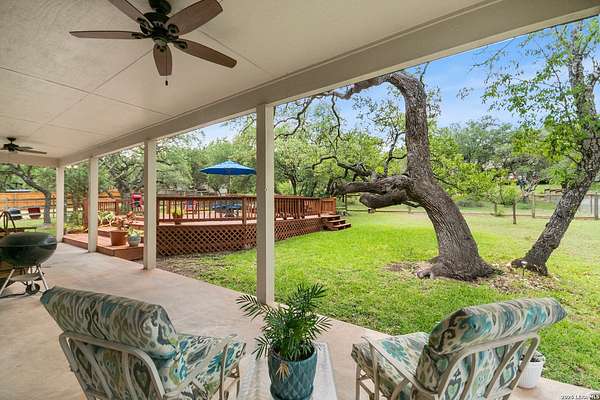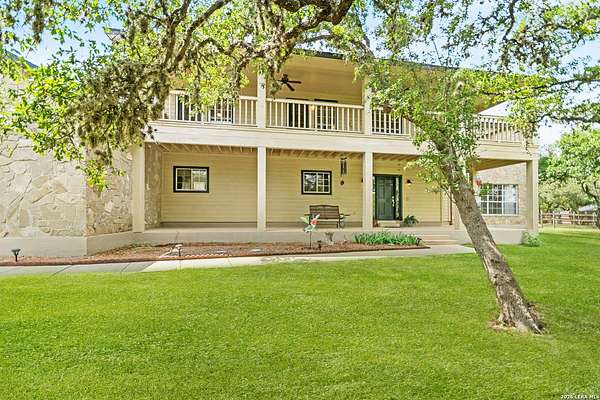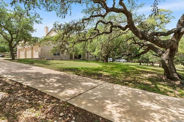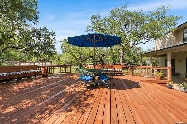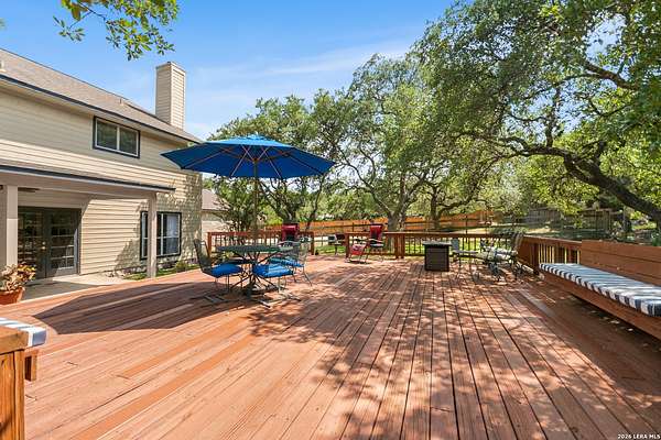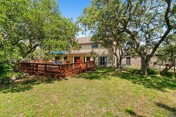 Custom built by an award-winning builder, this unique home is now available in the very sought-after Fair Oaks Ranch, which has one of the safest city rankings in Texas! This home is within walking distance of the Fair Oaks Ranch Golf & Country Club, which offers two 18-hole golf courses, pools, tennis & pickleball courts, a fitness center, and dining options with membership. Location is everything, and this home and accompanying area provide an opportunity to enjoy wildlife, and the convenience of easy access to IH10, downtown Boerne, San Antonio, and the highly acclaimed Boerne ISD schools. Nestled in a private, gated community with live security, 8519 Alydar Circle in Raintree Woods reflects the timeless charm of Fair Oaks Ranch and compliments the natural beauty of the Texas Hill Country. Set on 1.6 beautifully oak studded acres in a quiet cul-de-sac, this 4-bedroom, 3-bath home offers 3,346 sq ft, including a dining room, three living spaces, and a walk-in bar. Flooring throughout is selectively comprised of hardwood, tile, and carpeting. One feature that sets this home apart from many others is the inclusion of three wood-burning fireplaces (including a dual-sided fireplace that opens into the primary suite, AND primary bath), three sets of French doors that open to a covered back porch, and a massive deck to enjoy the Texas Hill Country. Upstairs you'll find four large bedrooms, (3 of which have walk-in closets), and two full baths, with an expansive second-story covered deck that is accessible from three of the upstairs bedrooms, inviting you to relax outdoors. The kitchen and downstairs bath have been stylishly updated, and other recent upgrades include new carpet, fresh exterior paint, new back fencing, and refinished decking. Other highlights include a 3-car garage, large laundry room, abundant storage, and again, all this in a prime location. An important final note is that Fair Oaks Ranch is almost completely inclusive of single-family residences, limiting the addition of high-density and/or commercial growth. So, if you are interested in a custom-built home, in a quiet, upscale community with a high safety ranking, abundant wildlife, close to excellent schools, Boerne, and full services Country Club available, you won't want to miss this gem!