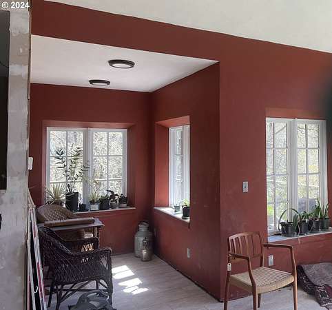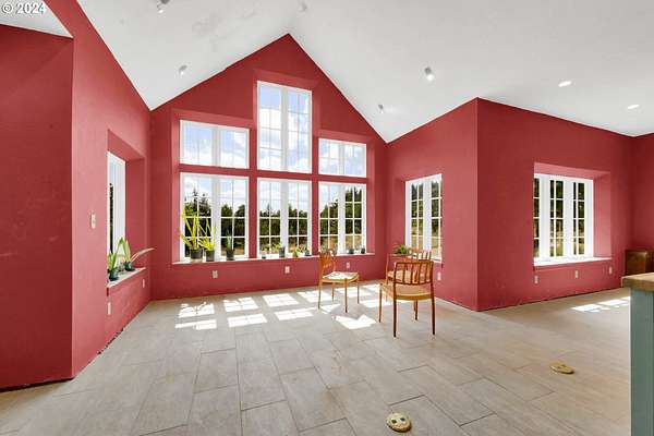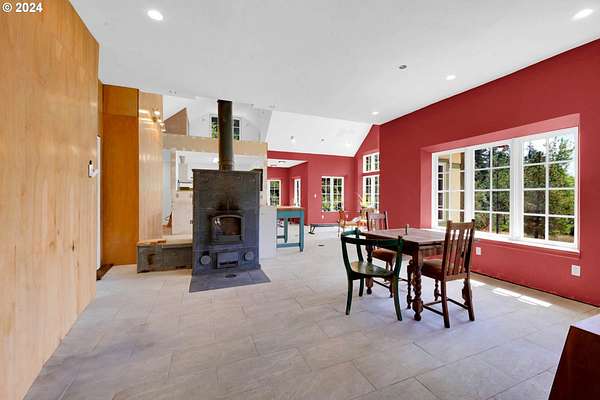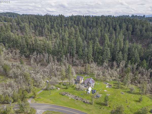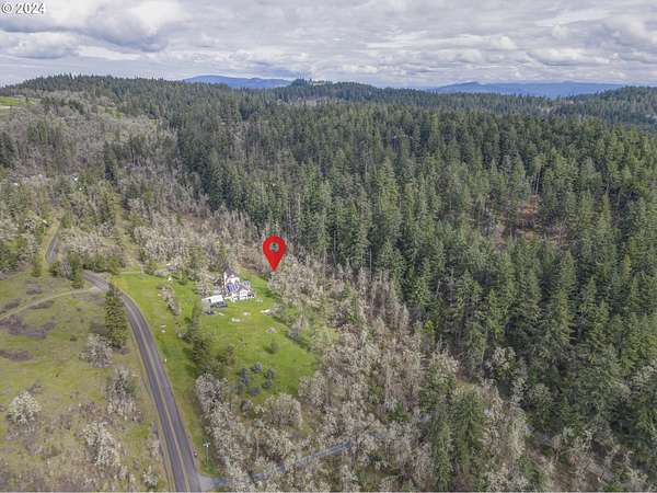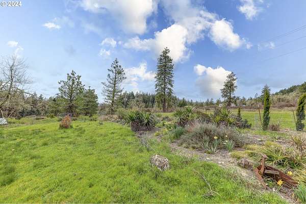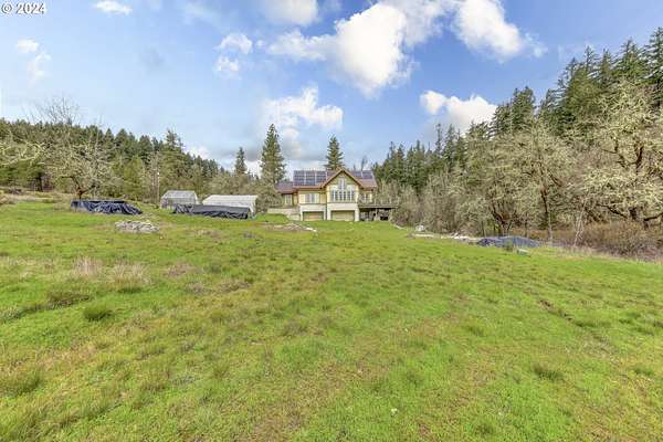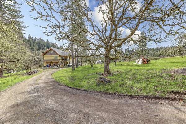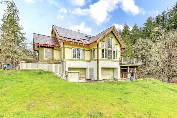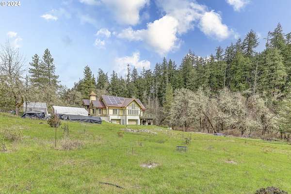 Situated on over 30 beautiful acres just a short distance from Eugene city limits stands two amazing one-of-a-kind homes. The main house, inspired by the elegance of Norwegian church architecture, offers meticulous craftsmanship and premium specialized materials throughout. Expansive living/dining room with tile floors & recessed lighting. There could be 2 bedroom suites, one on each level plus an additional 3rd bedroom. While the interior still needs some finishing, the structure is Faswall construction which provides a 4-hour fire protection rating, R25 and R60 insulation and is equipped with a whole house Zehnder air filtration/exchange system that provides clean air ventilation! Heating is supplied by an innovative air to water heating system plus a grand soapstone wood stove and two ductless heat pumps, one for water, one for house. 4KW solar cells add to the efficiency of this innovative home. Serenity and nature surround you as you enjoy the awesome endless views. Wrap around concrete floored deck, fruit trees, seasonal pond, greenhouse, numerous specialized plantings, non-native oak and so much more. Every detail has been carefully considered with unique exceptional construction. The carriage house is approx. 700 sq ft on the main level and is an open room on the upper level.