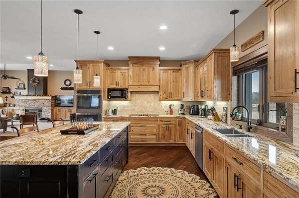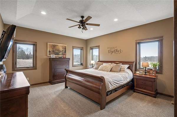 Exceptional storage awaits with an oversized 3-car garage and a 2,000 sq. ft. heated, insulated pole building with a paint booth and 200-amp service. The fully irrigated lawn (20 zones) ensures lush greenery all summer.