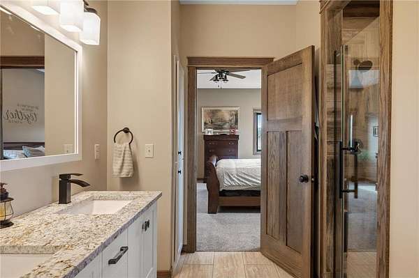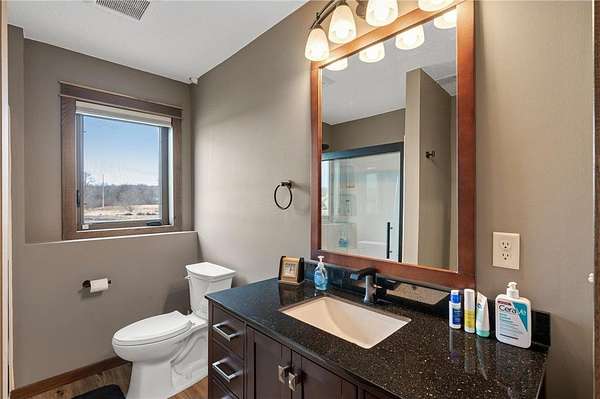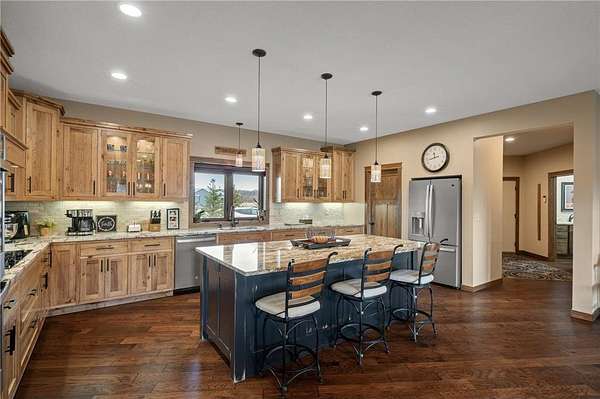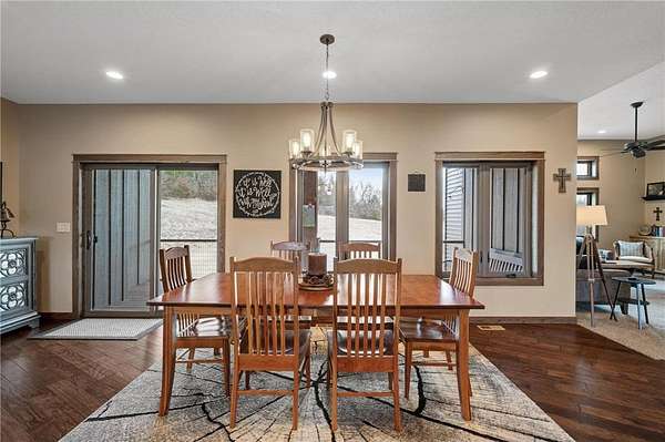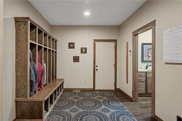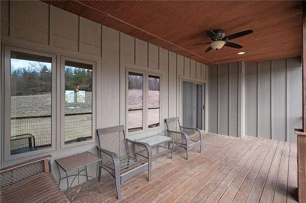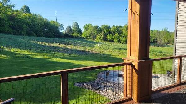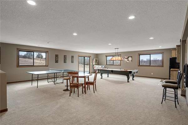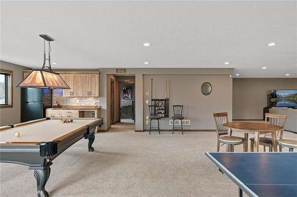 The lower level features a sprawling family and game room with in-floor heat. Game room also offers a stunning wet bar with custom hickory cabinets and a black walnut live edge counter top. opening to a large patio with a custom fire pit. Additional outdoor spaces include a welcoming front porch and covered back deck, perfect for peaceful wildlife viewing.