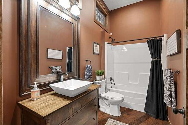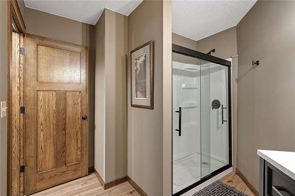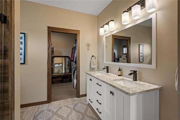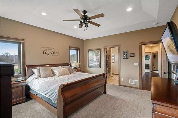 The luxurious main-level primary suite offers vaulted tray ceilings, an expansive ensuite with a oversized 6x4 shower, dual sinks, and a spacious walk-in closet.