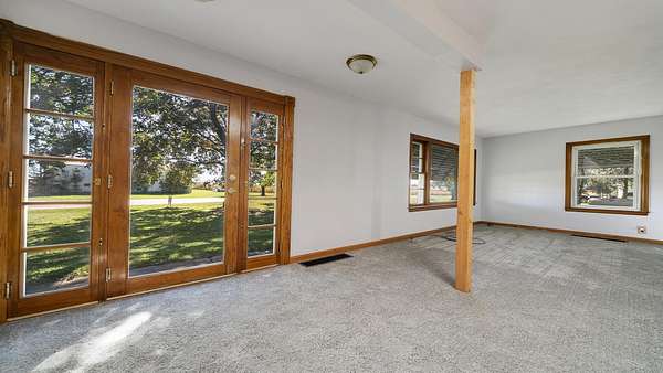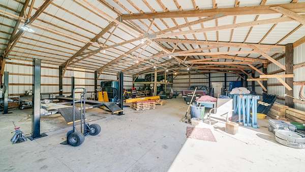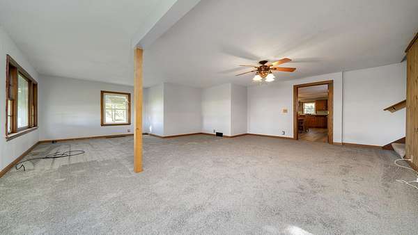 Nestled on 8.27 acres, this two-story home offers privacy surrounded by mature trees and agricultural zoning for flexible use. The main level features a welcoming living room and a spacious kitchen with generous cupboard and counter space, plus room for a large table or island. A primary bedroom, full bath, and new first-floor laundry hookups complete the first level. Upstairs, you'll find two additional bedrooms and another full bath. Freshly painted and carpeted throughout, the home feels bright and move-in ready. Outside, enjoy a detached two-car garage and a 40x80 outbuilding with loft, concrete floor, and generator hookup--perfect for storage, hobbies, or equipment. Recent updates include a furnace installed last year, a roof about four years old, and a fully redone well system less than two years ago. Two septic systems serve the home--one for the house and one for the kitchen. The water heater is older. A wonderful blend of acreage, comfort, and practicality.