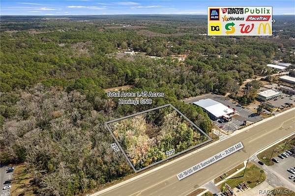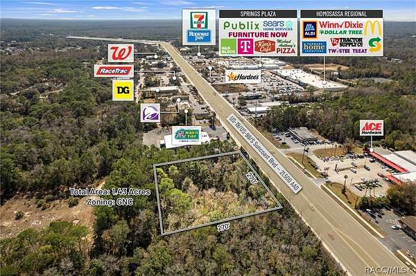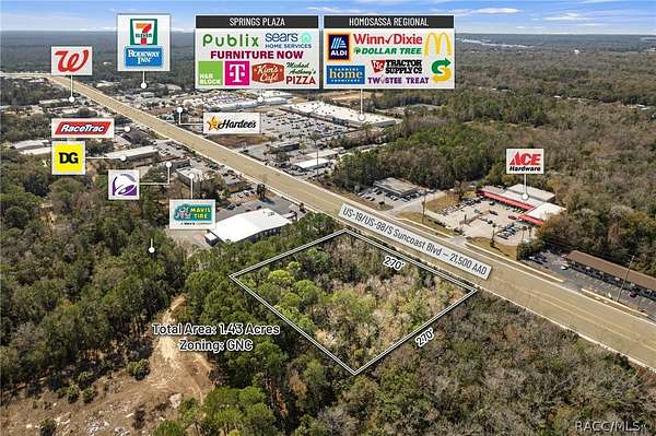 Positioned directly on US Hwy 19/98 in the heart of Homosassa, this 1.43+/- acre GNC commercial parcel offers 270+/- feet of prime highway frontage with exceptional visibility and direct exposure to 21,500 vehicles per day. Located within the Tampa-St. Petersburg-Clearwater MSA, the 18th largest MSA in the United States, the site sits in the center of Citrus County's most established and rapidly expanding retail corridor. The property allows for a broad range of commercial uses including restaurant (drive-thru or sit-down), gas station/C-store, neighborhood shopping center, medical/professional office, and general retail or service-based concepts. The combination of zoning flexibility, frontage depth, and traffic volume makes it ideally suited for national QSR operators, fuel brands, medical users, and service-based retailers seeking dominant visibility in a high-growth market. Surrounding national and regional retailers include Publix, Tractor Supply, RaceTrac, 7-Eleven, Walgreens, AutoZone, McDonald's, and Wendy's, providing established co-tenancy synergy and consistent daily consumer traffic. The corridor is further strengthened by year-round tourism and outdoor recreation, driven by proximity to Ellie Schiller Homosassa Springs Wildlife State Park and the Homosassa River, both of which attract anglers, eco-tourism visitors, and seasonal residents. Citrus County is one of the fastest-growing counties in Florida, with a current population of approximately 153,600 residents projected to exceed 350,000 by 2030 per County growth planning estimates. The region continues its transition into a major residential, healthcare, and service hub within the Tampa Bay sphere of influence. Significant infrastructure investment continues to accelerate long-term growth. The $135 million expansion of the Suncoast Parkway and the planned northern Phase 3 extension-just north of the subject property-will provide direct one-hour access to Tampa International Airport and major employment centers, dramatically increasing regional connectivity, tourism flow, and commercial demand. Within a 15-minute trade area, the property serves approximately 46,361 residents with stable demographics (average age 58; median household income approximately $65,000). The combination of sustained population growth, expanding infrastructure, and strong retail clustering positions this site as a high-visibility, future-proof commercial investment opportunity.