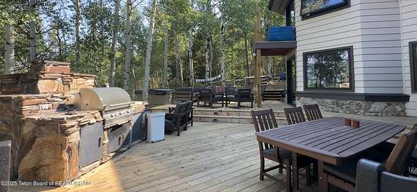 Rare opportunity in the prestigious Gros Ventre West Subdivision. This thoughtfully remodeled mountain estate sits on 3.89 private, wooded acres abutting conservation land. Teeming with local wildlife, this special property creates a true feeling of a wilderness retreat. Nestled lower on the butte, this prime location delivers sweeping views of the Teton range and Walton ranch lands, with convenient access to Jackson, Wilson, and Teton Village. The main residence features new top-of-the-line Wolf appliances, new flooring, windows, and lavish bathrooms with Victoria and Albert bathtubs, plus expansive walk-in closets and two luxurious ensuite primary bedrooms. A separate 3-bedroom guest house offers additional space and comfort. Expansive decks surround the property, ideal for enjoying everything this mountain sanctuary has to offer!