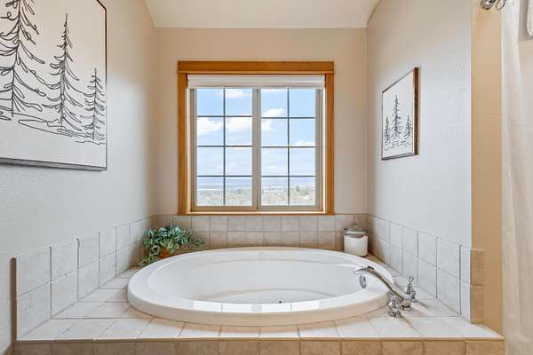 - Breakfast Bar, Ceiling Fan(s), Double Vanity, Enclosed Toilet(s), Kitchen Island, Linen Closet, Open Floorplan, Pantry, Primary Downstairs, Shower/Tub Combo, Soaking Tub, Spa/Hot Tub, Tile Counters, Tile Shower, Vaulted Ceiling(s), Walk-In Closet(s)