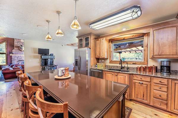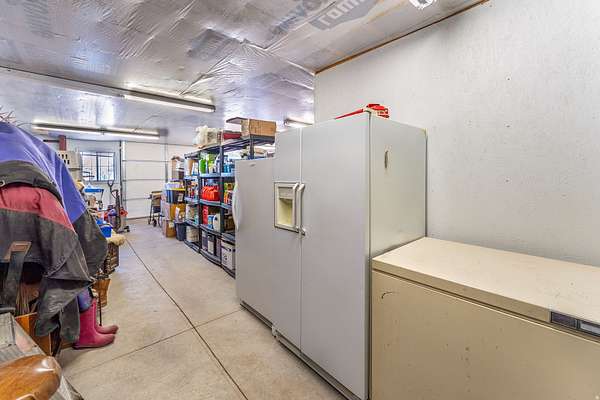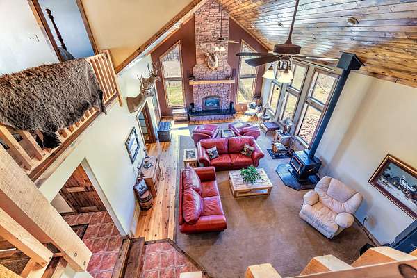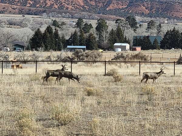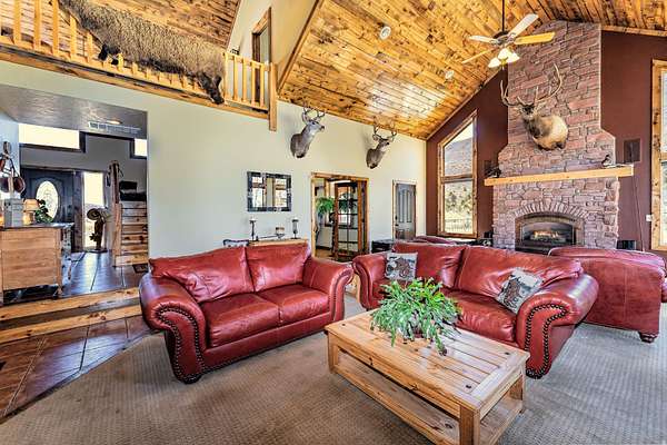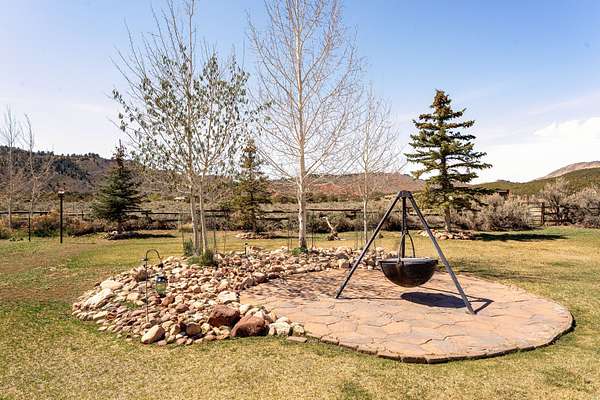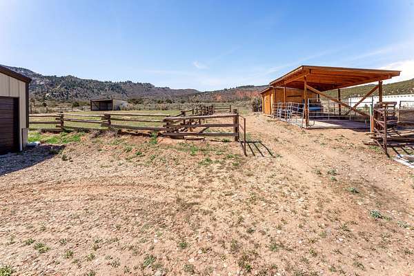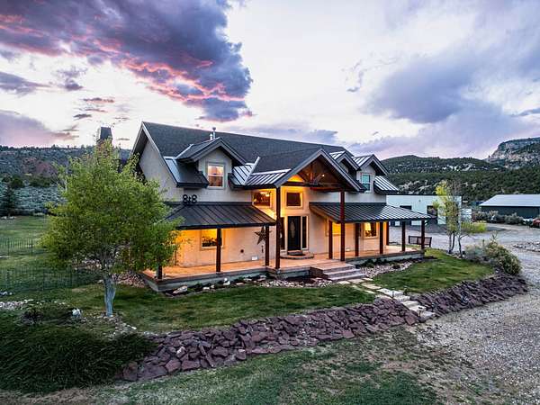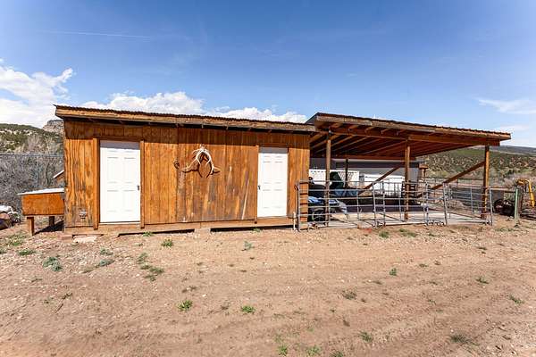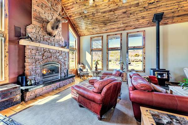 Tucked into the heart of Dry Fork Canyon, this remarkable 8-acre estate offers more than a home-it delivers a lifestyle surrounded by some of Vernal's most iconic scenery. Towering Navajo sandstone cliffs create a dramatic backdrop, while nearby access to McConkie Ranch Petroglyphs, the Flume and Narrow trailheads, Red Cloud Loop, Flaming Gorge, Red Fleet Reservoir & Ashley Gorge via Ferrata puts outdoor adventure close by. A covered wrap-around porch welcomes you into a thoughtfully designed residence where craftsmanship and comfort meet. Inside, the great room makes an unforgettable first impression with soaring 24-foot tongue-and-groove vaulted ceilings, expansive wood-framed windows, and a striking floor-to-ceiling stone fireplace, complemented by a Blaze King wood catalytic stove. Natural light and panoramic canyon views fill the space, creating a true sense of mountain elegance. The kitchen serves as the heart of the home, featuring granite and quartz countertops, custom alder cabinetry with built-in details, a gas range, and a new updated refrigerator. Whether gathered at the breakfast bar or seated in the charming circular dining nook, every space is designed to take in the surrounding views. The main-level primary suite offers a peaceful retreat, complete with a spa-inspired bathroom featuring a freestanding soaking tub, walk-in shower, and walk-in closet. With four bedrooms and two-and-a-half bathrooms, the home balances comfortable private spaces with inviting areas for entertaining. Designed with both function and versatility in mind, the property is fully equipped for animals and hobbies alike. Much of the acreage is pipe-fenced, with established pasture on the front and south side, and a fully fenced back area that includes a 20' x 24' lean-to. The impressive 3,500 sq. ft. red iron shop with attached lean-to provides exceptional workspace, featuring five bay doors, 200-amp separate service, commercial-grade wiring, a 50-amp RV hookup, and dedicated areas for storage, projects, and even a custom sauna. Outdoor living is just as exceptional, with a stamped patio, pergola, and custom rock firepit area perfect for enjoying peaceful canyon evenings. Additional amenities include a high-fenced garden, chicken coop with run, covered hay storage, multiple water hydrants, and ample storage throughout. The property is also supported by 1,000-gallon and 500-gallon propane tanks for added convenience. This is a rare opportunity to own a private canyon retreat that seamlessly blends refined living with the rugged beauty of the surrounding landscape. Buyer to verify all information, including square footage.