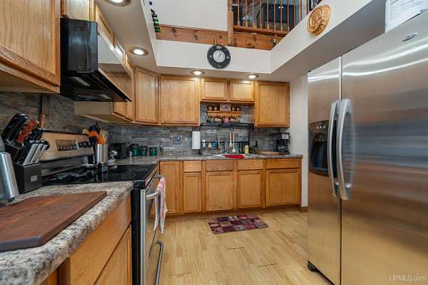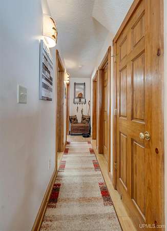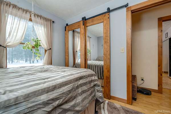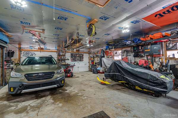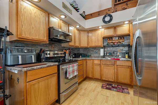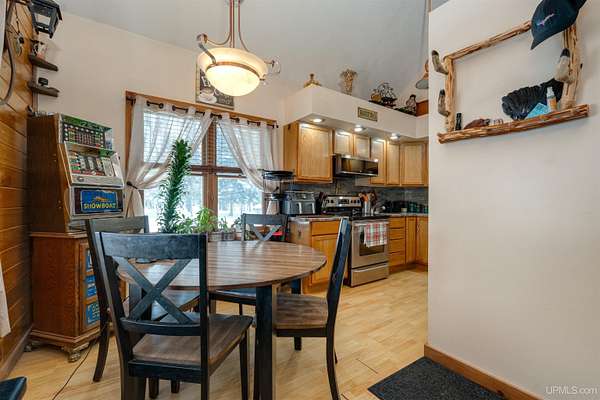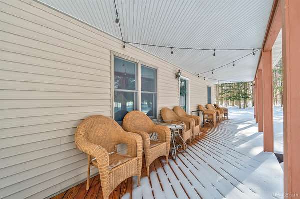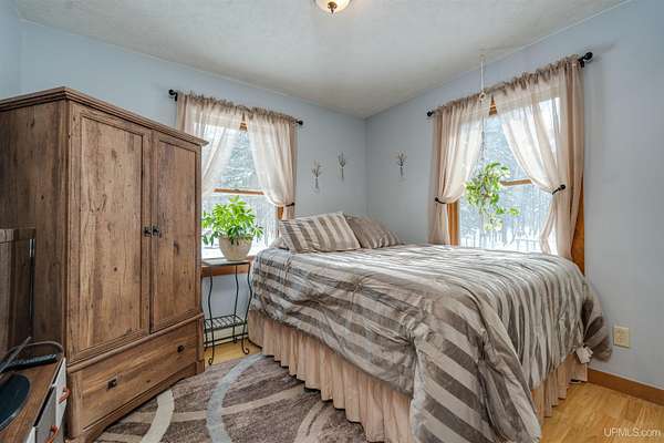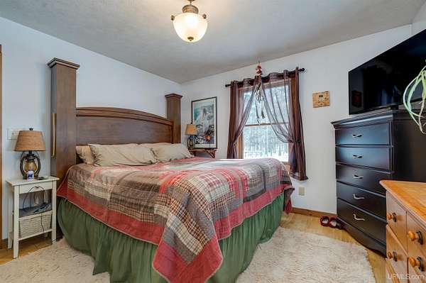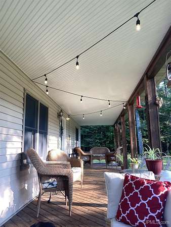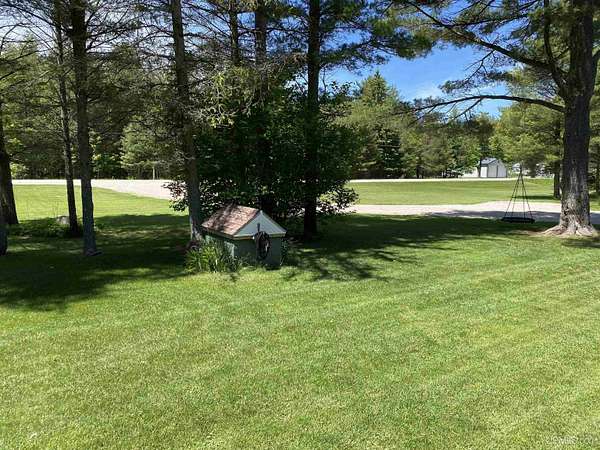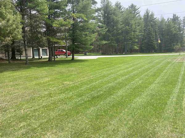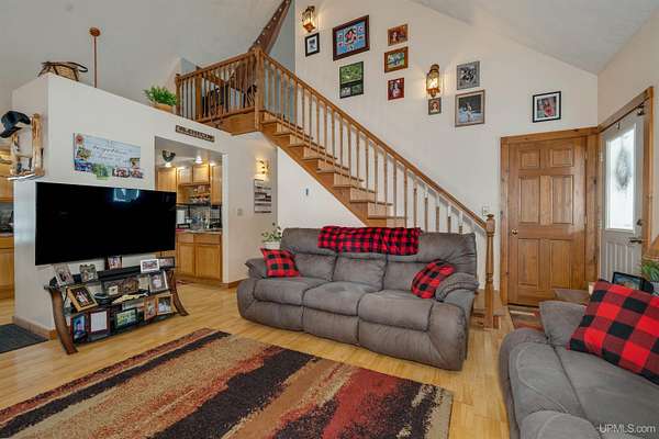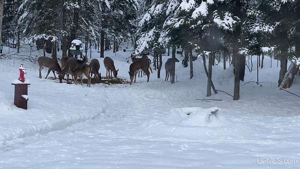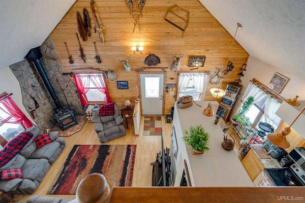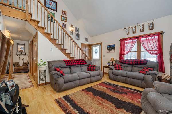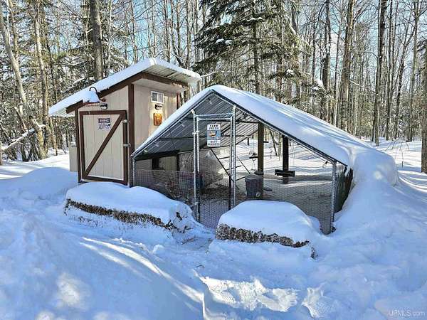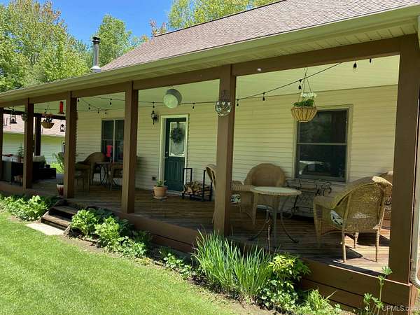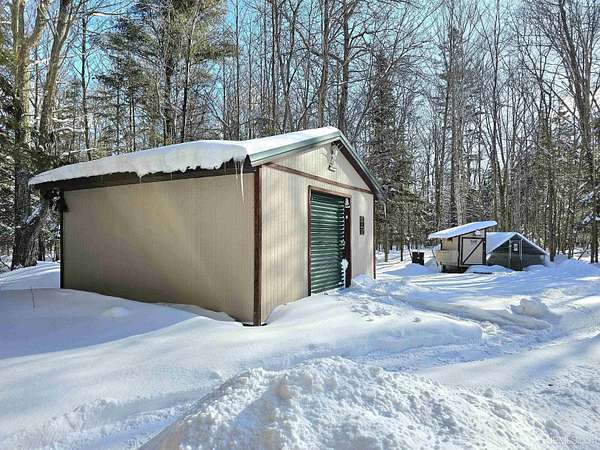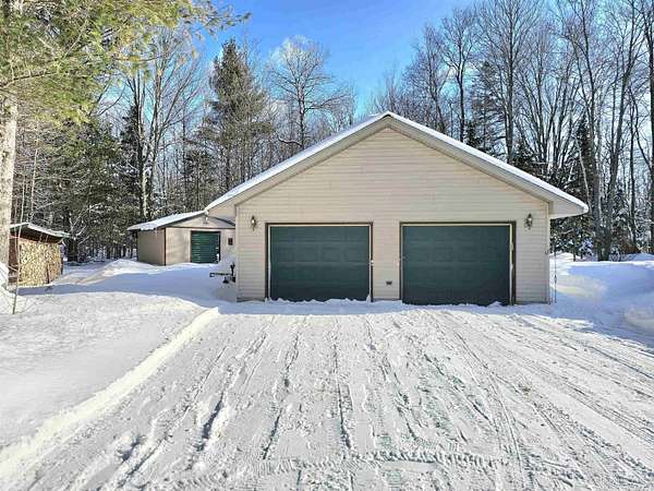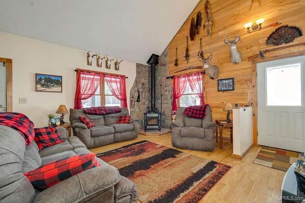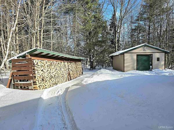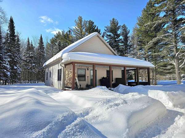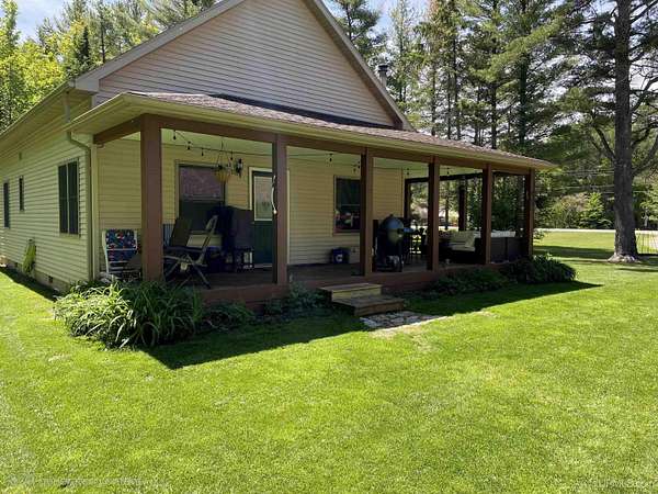Nestled on 5 beautifully wooded acres just minutes from Manistique, this well-maintained 3-bedroom home built in 2003 offers the perfect blend of comfort, convenience, and country living. The main floor features true one-level living with two bedrooms, a full bath, and laundry, while the warm and inviting living room showcases soaring vaulted ceilings and a stunning stone-surround wood stove that serves as the primary heat source, complemented by electric baseboard heat and natural gas available at the home. Upstairs, you’ll find a spacious third bedroom overlooking the open living area below. Step outside to enjoy the expansive wrap-around covered porch—ideal for relaxing summer evenings and taking in the peaceful setting. The 26x36 detached garage is finished, insulated, and heated, creating the perfect space for storing recreational vehicles, working on projects, or gathering with friends, and additional outbuildings include a covered wood storage area and a 16x16 shed with a roll-up door for your lawn equipment. The wooded acreage offers excellent hunting opportunities with abundant deer and turkey, and the property is accessed by a gravel drive off a year-round paved road. Serviced by a well and septic system, plus High-speed internet is already connected, and all appliances, along with a deer blind and chicken coop/pen, are included—making this a turnkey opportunity to enjoy rural living with close-to-town convenience.