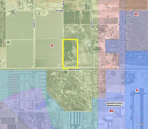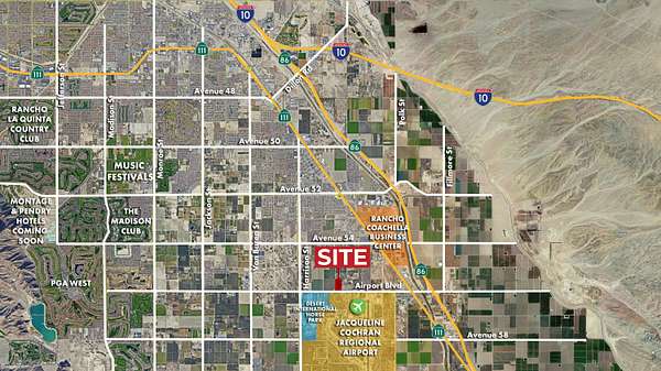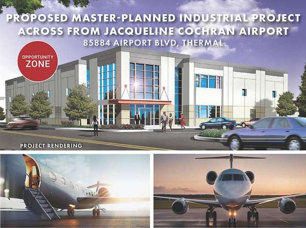 Est $31,083/mo19.5 acres across from Jacqueline Cochran Regional Airport, with 43,500 aircraft operations in 2023. Jacqueline Cochran Regional Airport is currently exploring the possibility of adding commercial air service and cargo service to the facility. Conceptual plans for 392,880 SF industrial building and 300,110 SF state-of-the-art four building master-planned industrial project with dock high loading & large yards (see page 3). Utilities in street. Approx. 13,800 cars/day on Hwy 111. New interchange at Airport Blvd & Expressway 86. Three miles to The Thermal Club, a private high end race track. Across from Desert International Horse Park.