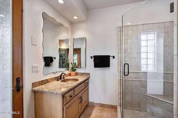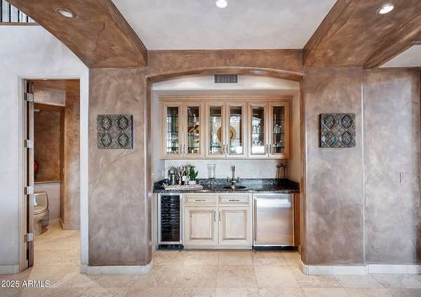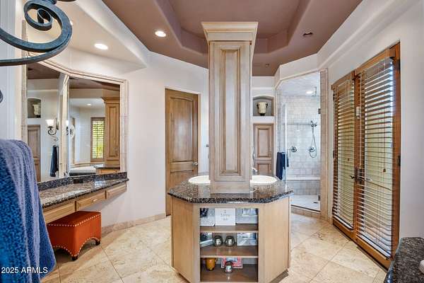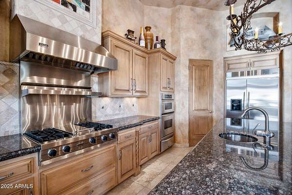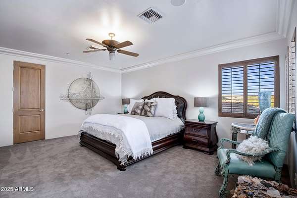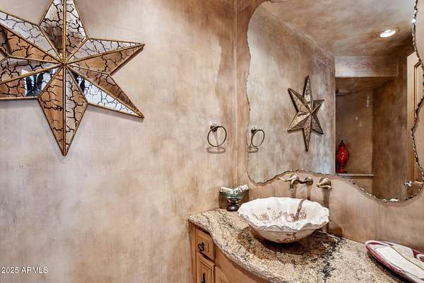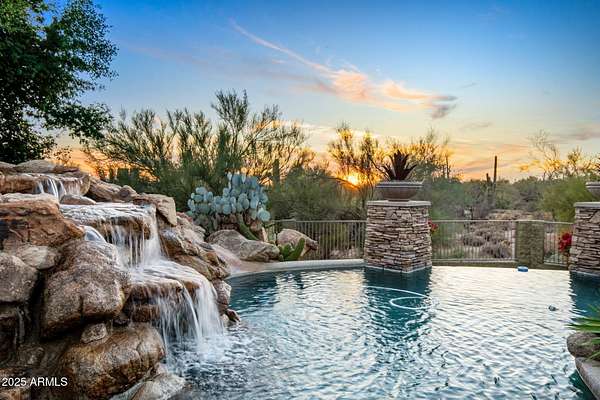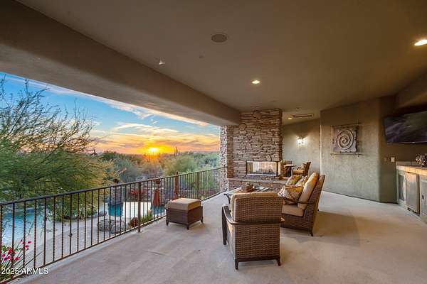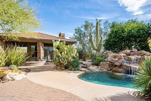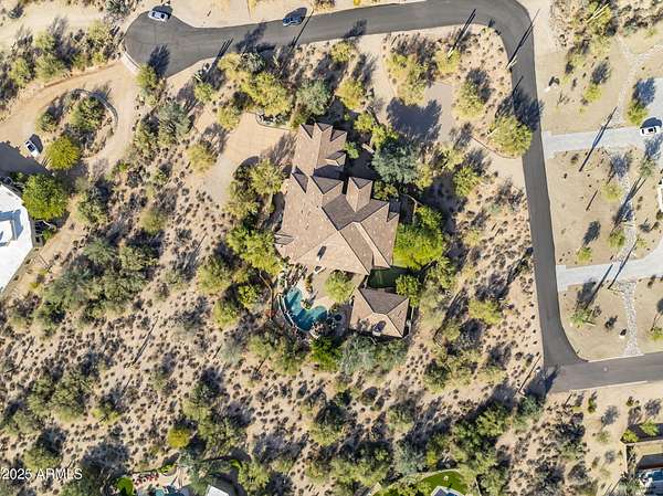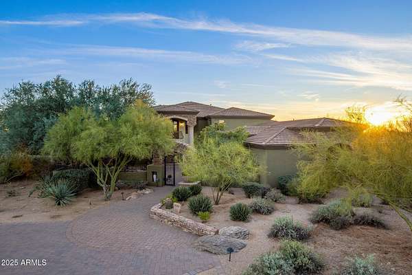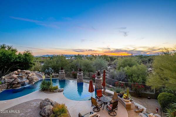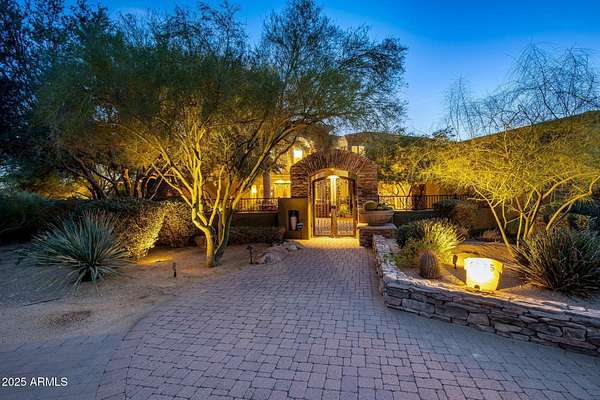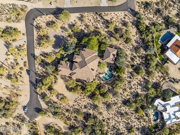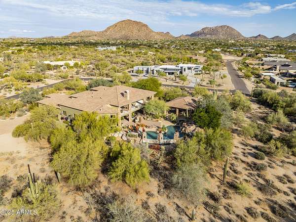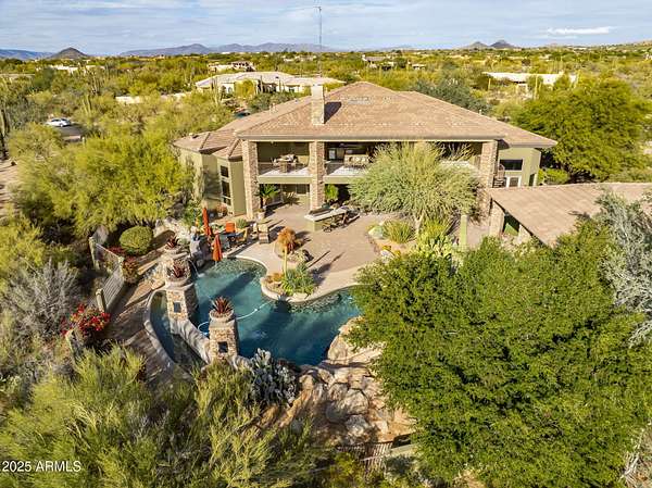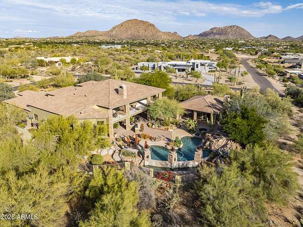 Welcome to a one-of-a-kind luxury custom home in North Scottsdale, perfectly situated on 2.2 acres with no HOA and just minutes from world-class dining, shopping, and entertainment. Enter through the grand foyer to find a chef's dream kitchen, complete with high-end finishes, stainless-steel appliances, and a spacious island flowing seamlessly into the open family room. Ideal for hosting, the home features a formal dining room and a wine cellar/tasting room that holds over 300 of your finest bottles. The grand primary suite on the main floor offers a cozy fireplace, dual vanities, a cosmetic counter, a jetted tub, and stunning views of the backyard oasis. Upstairs, the second master bedroom boasts a luxury bath, walk-in closet, and just a short walk to access the large balcony with a dual-sided fireplace and breathtaking mountain and city light views. Step outside to a backyard paradise designed for endless enjoyment, featuring a heated pool, spa, grotto, slide, built-in BBQ, Big Green Egg grill, putting green, and an expansive patio perfect for entertaining. The property also includes a charming guest house with a full kitchen, granite counters, beautiful cabinetry, and a fireplace. Nestled in a quiet cul-de-sac, this unique estate offers unparalleled luxury, privacy, and convenience. Don't miss your chance to own this spectacular North Scottsdale retreat!