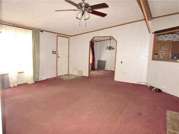 Estate property sold AS IS only. Bright open areas in living room, which features a wood burning fireplace, built in shelving, access to the kitchen with an island, granite counter tops, dishwasher, stove and refrigerator. All appliances are as is only. Property has been vacant for a while, so septic is inactive. Enjoy the 3 bedrooms, 2 full baths, main bath has tub/shower. Primary bedroom is large, cathedral ceilings, bright windows. Primary bath offers shower, garden tub, large walk-in closet. Tankless on demand water heater is in this closet. Laundry is located at the back of the house near the back door. Bring your ideas and plans to bring this home back to its charming self. 3 acres to wander, some wooded.