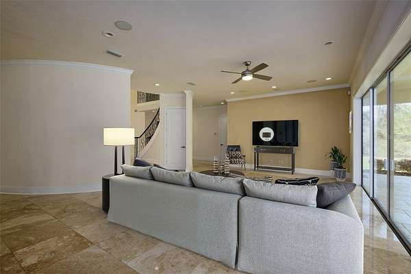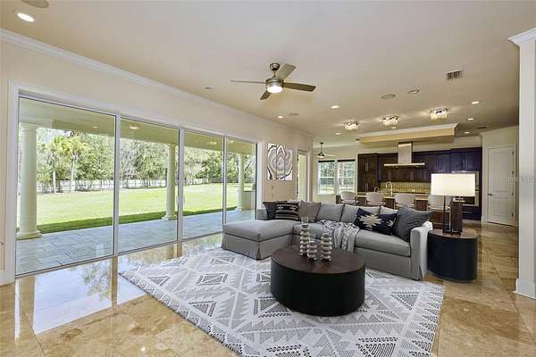 The open-concept main level is designed for both entertaining and everyday living, featuring expansive living and family rooms with floor-to-ceiling glass doors that seamlessly connect to a spacious backyard oasis. Enjoy Florida living at its finest with a large patio, outdoor kitchen, and plenty of room to relax or entertain.