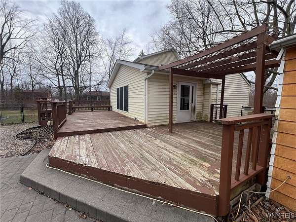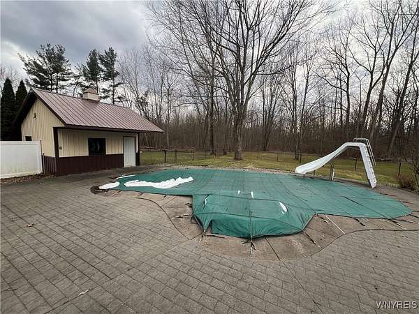 Est $2,290/moVictorian Style Cape resting on over 4 acres of property in sought after Clarence Center NY. This property boasts first floor primary bedroom with walk in closet, first floor office that easily could be used as fourth bedroom, two upstairs bedrooms, two full baths, and large family room overlooking yard with fire place/raised ceilings. Outdoors you will find a stunning massive lot with three car garage, inground pool, pool house, stamped concrete patio, and two tiered deck for all your entertaining needs. All Owner Occupant offers will be responded to after 7 days on the market. Investor offers responded to after 30 days. However, all offers can be submitted anytime during the First Look period