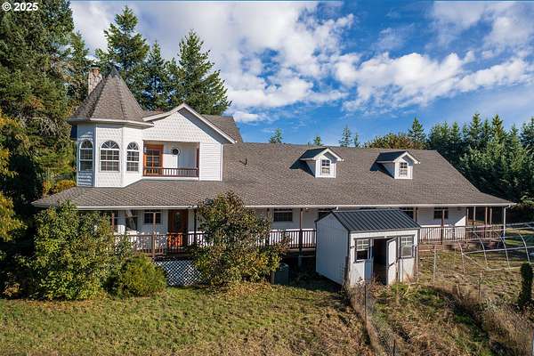 Nestled on a breathtaking 2-acre property, this exquisite 3 bedroom, 3 bath custom home is surrounded by lush trees and vibrant shrubs that come alive with color each autumn, framed by rolling nearby hills. Enjoy complete privacy and serenity-all just minutes from town. The interior of the home features thoughtfully designed spaces ideal for flexible living, guests, or entertaining, including a spacious bonus room with endless possibilities. Each room has been lovingly crafted to create warm, inviting areas you'll love spending time in. The primary suite offers a light-filled retreat with its own ensuite bathroom and a stunning Victorian turret-style sunroom surrounded by windows, along with private balcony. Each bedroom includes access to its own balcony, and every bathroom is finished with elegant quartz counters. Additional highlights include a 5-bay garage with automatic door openers and vinyl-coated flooring, plus a fenced garden area with spacious shed-perfect for hobbyists or gardeners alike. Experience the best of comfort, craftsmanship, and natural beauty in this one-of-a-kind property.