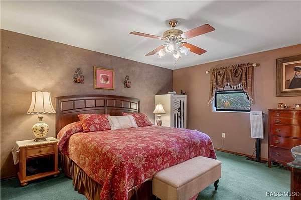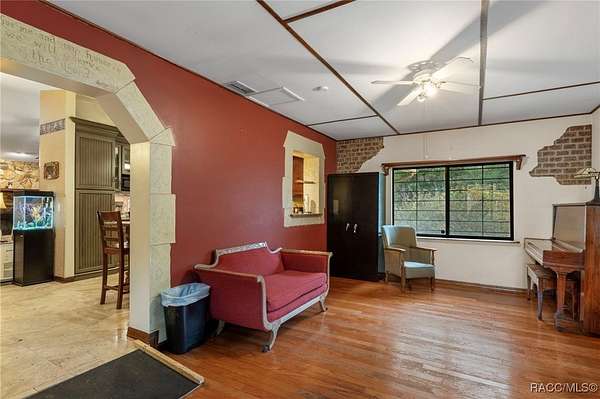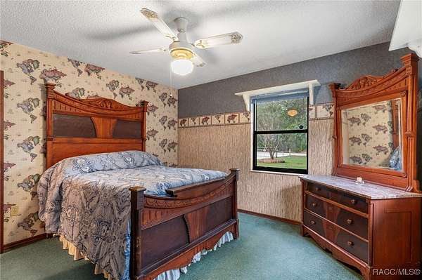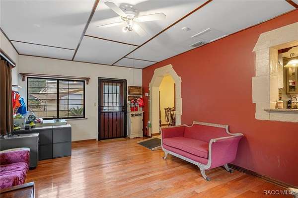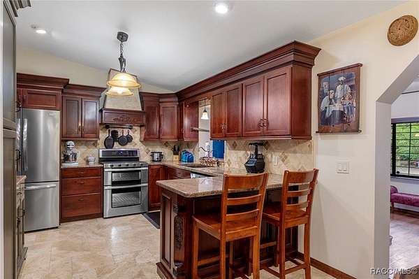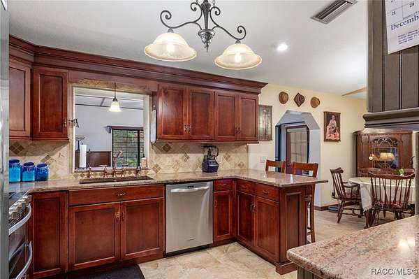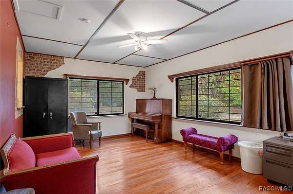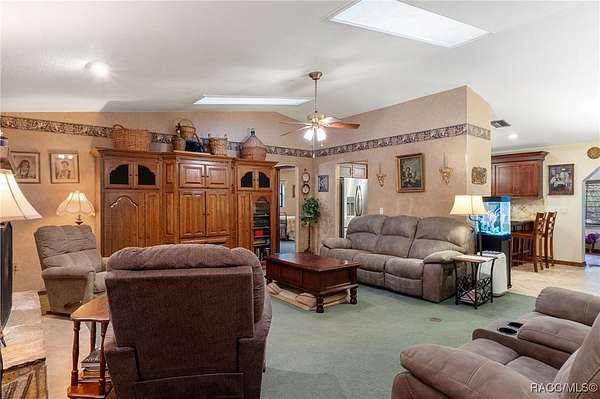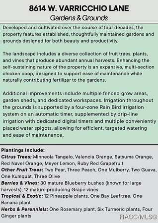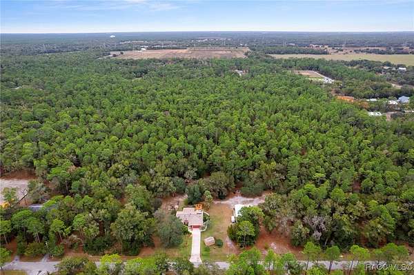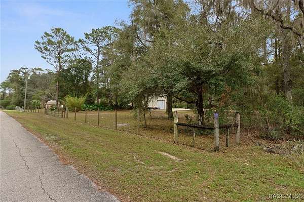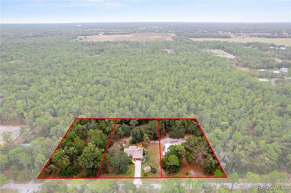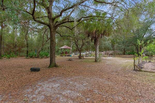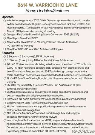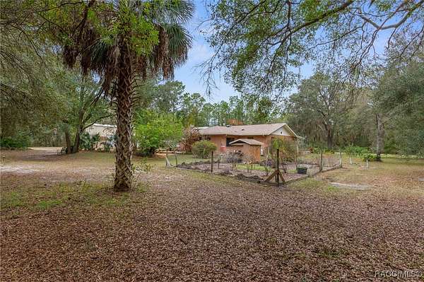 Acreage, no HOA, no through traffic, extensive updates, and room for animals-this is not just the Florida homestead you've been searching for, but a historic Citrus County property held by the same family for over 50 years. This custom-built 3-bedroom, 2-bath ranch-style home sits on a fully fenced and gated 3.03 acres (three adjoining 1.01-acre lots) and backs up to 45 acres in the desirable DeRosa Village community just north of downtown Crystal River, home to world-renowned Three Sisters Springs and Kings Bay. The split-plan home features an open-concept living and dining area with a vaulted ceiling, recessed lighting, and a striking natural stone fireplace. Travertine flooring accents the entry, kitchen, and dining areas, while multiple skylights enhance natural light throughout. The kitchen offers custom imported hardwood cabinetry, granite countertops, stainless steel appliances, and a gas oven-range with custom exhaust hood, supplied by an on-site 100-gallon propane tank. Hardwood cabinetry and granite continue into the dining area with a built-in bar and wine rack. The adjacent family room showcases hardwood floors and windows overlooking the landscaped grounds. The primary suite includes a walk-in closet and private bath with custom vanity, granite counters, and a large arched walk-in shower with seat and a ceiling-mounted rain shower head. Two secondary bedrooms share a well-appointed bath with custom cabinetry, granite, travertine, and built-in shower shelving. Adjoining the living room is a 462-sq-ft finished flex space and utility room that offers versatility as an office, hobby room, gym, or bonus space. Infrastructure highlights include a 26kW Generac whole-house generator (2025) supplied by an in-ground 500-gallon propane tank with wireless fuel monitoring, a hardwired security system, custom metal security doors, and 3M safety and security window film installed on all windows and skylights. Outbuildings include a 20' x 40' steel accessory building with concrete floor, electric service, and two 16' x 10' pull-through garage doors, plus a 12' x 16' barn-style shed with double lofts. The grounds have been lovingly developed and cultivated over four decades, featuring productive gardens, fruit trees, vines, and tropical plantings, supported by fenced grow areas, a multi-section chicken coop, garden sheds and dedicated workspaces. Irrigation is managed by a four-zone Rain Bird system with automatic timer, drip-line irrigation with digital timers, and multiple water spigots. Major updates include the whole-house generator (2025), new septic drain field (2022), garage-to-flex space conversion (2022), new roof (2021), and new HVAC (2021). The home, accessory building, and barn shed are located in preferred Flood Zone X, where no flood insurance is required. Conveniently located just minutes from the future Citrus Avenue exit of the Suncoast Expressway (est. completion Q4 2026-Q4 2027), once completed this will enable enhanced access to the Tampa Bay metro. Showings by appointment only.