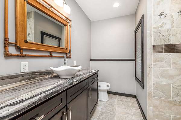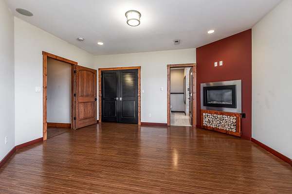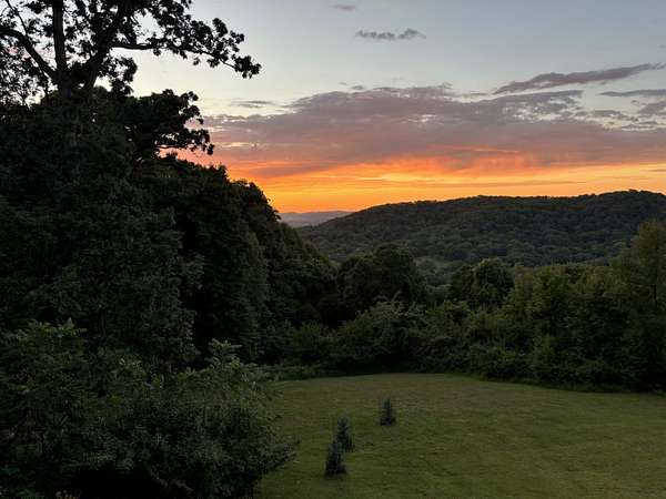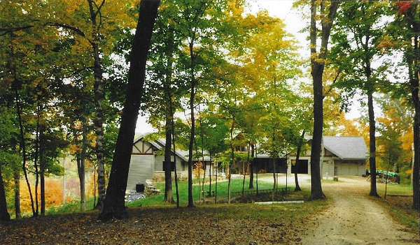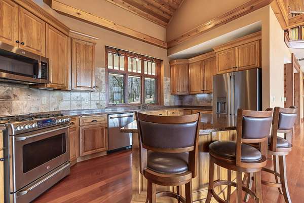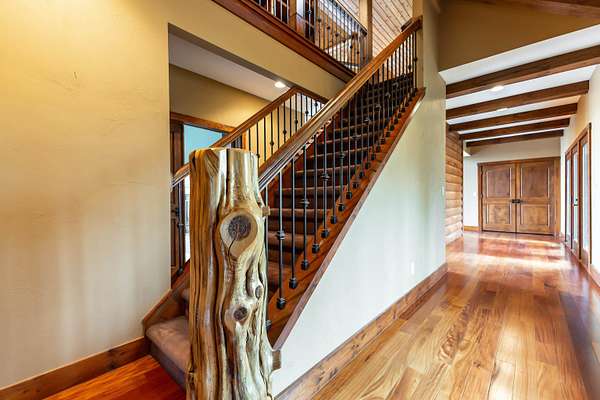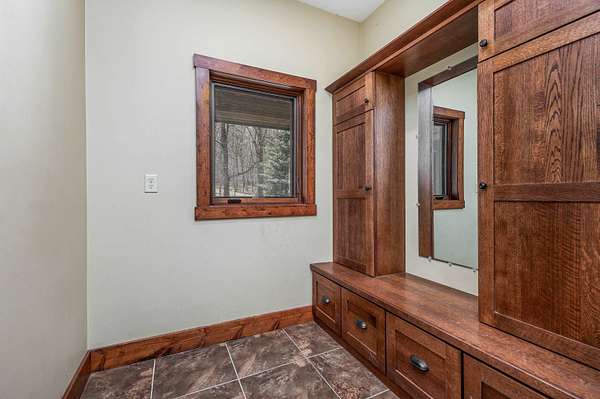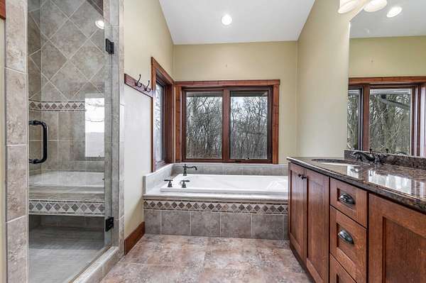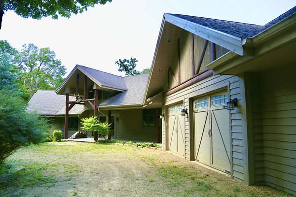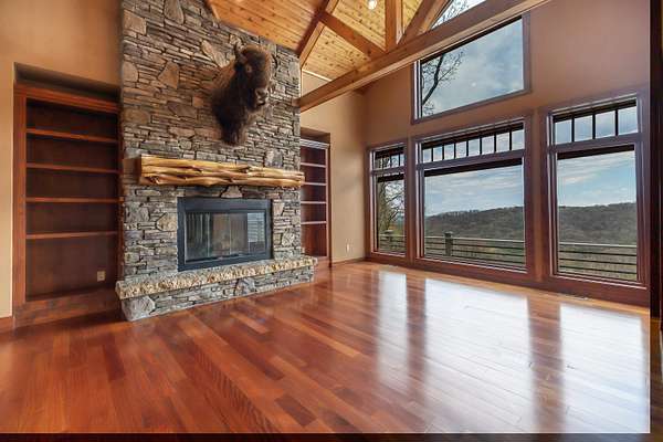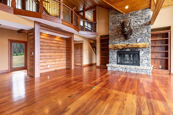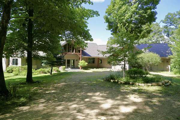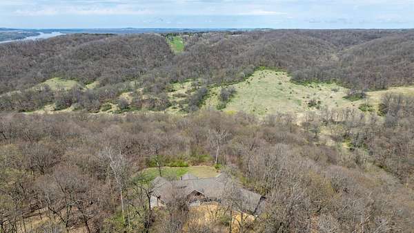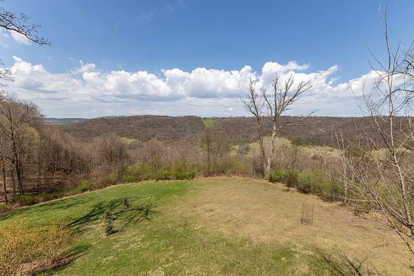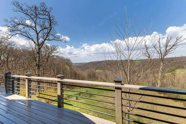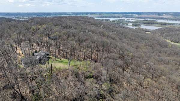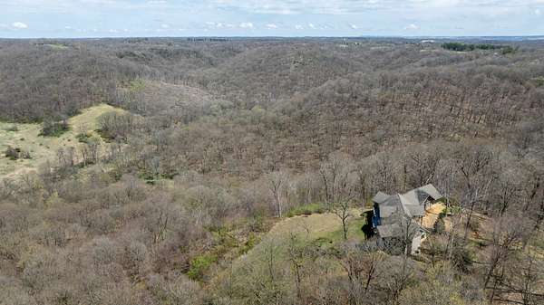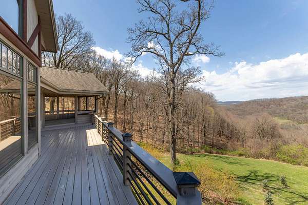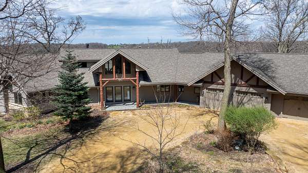 Tucked within scenic Great Mississippi River Ridge on 5.42 beautifully wooded acres just 10 miles outside of historic Galena, this sprawling 3 bed, 3 bath western-style retreat blends lodge-inspired architecture with timeless craftsmanship and over 4,000 square feet of warm, inviting living space set perched on a treed bluff offering seasonal glimpses of the Mississippi River, distant views of Chestnut Mountain Ski Resort, and breathtaking countryside views that span for miles, allowing this extraordinary estate to capture the spirit of the countryside no matter what the season! A long gravel drive leads you to a stunning timber-accented facade with log posts, antler details, and a welcoming covered porch that opens to a captivating great room, where a soaring wood-clad cathedral ceiling with exposed beam accents, rich Brazilian mahogany floors, a dramatic two-story stone fireplace, and a wall of windows create a true rustic centerpiece with sweeping views of the treetops and distant ridges beyond. The heart of the home is the warm, functional kitchen with hickory cabinetry, granite counters, stainless steel appliances, backsplash with real fossil stone accent tiles, pantry and integrated bar nook with glass paneled doors, and a spacious island with seating, perfect for preparing meals and gathering with guests, that feeds directly to generous dining area with plenty of room to entertain. A screened-in porch with vaulted wood ceiling and fan offers a tranquil setting to enjoy the landscape year-round, while the expansive deck wraps around the home, offering an incredible outdoor area to enjoy the gorgeous setting and spectacular vistas and colorful sunsets. The primary suite is a retreat of its own, featuring a tray ceiling, a gas fireplace flanked by built-ins, large windows framing peaceful views and direct access to the rear deck with covered area and a luxurious ensuite bath that includes a jetted tub, dual vanity, and tiled walk-in shower, with a huge walk-in closet with built-in storage systems and integrated dressing area just outside. The main level also offers a guest bed or study with reclaimed, antique double door access, built-in shelving, bookcase and large windows, a laundry room with ample storage and folding space, conveniently located powder room, and a mudroom with storage lockers that leads to massive three car garage with workshop space, ample room for gear, vehicles, or recreational storage and staired access to enormous unfinished room above, great for storage or future creative expansion. Upstairs, a dramatic vaulted loft with wood-paneled ceilings and overlook railings offers a charming flex space for a reading nook, office, or relaxing escape, with integrated storage and closet area. Head to the partially finished walkout lower level with radiant in-floor heat in most portions to find a sweeping family room with plenty of area for relaxation or recreation plus direct access to the grounds below, roomy guest suite with gas fireplace and adjoining private bath that features vessel sink and tiled shower, additional comfortable bedroom with built-in drop-leaf desk, nicely appointed full bath with dual vessel sinks, tub/shower combo and urinal, enormous unfinished storage space and unfinished art studio (would make a great bedroom with finishing) with direct access to cozy patio and rear yard. Home is located within the coveted Great Mississippi River Ridge Conservation Community offering approximately 140 acres of protected land including dense forests, open meadows, recreational trails and a pond. Additional amenities include knotty alder doors, Eagle and Andersen windows, and gutter guards. Whether you're looking for a weekend getaway, a nature-rich homestead, or a private retreat close to Galena's charm, this one-of-a-kind property offers the perfect balance of rustic elegance, modern comfort, and panoramic natural beauty. Covenants and Restrictions apply. Square footage is approximation.
