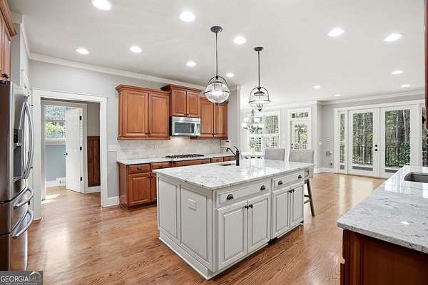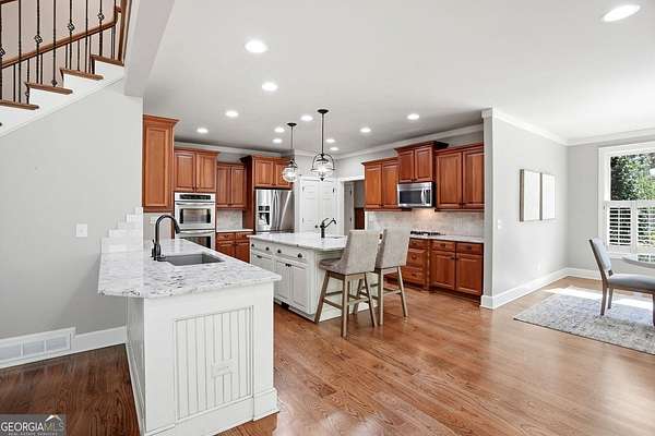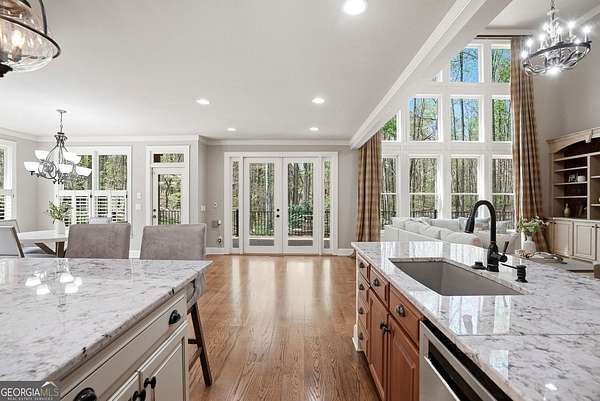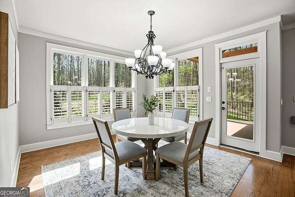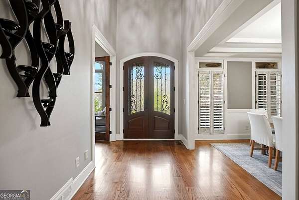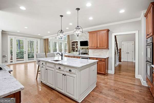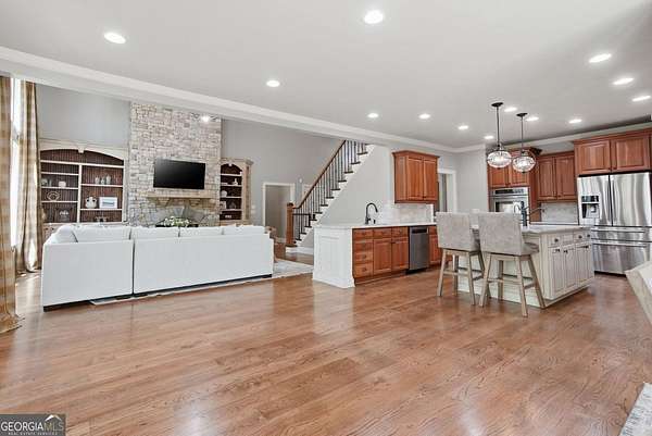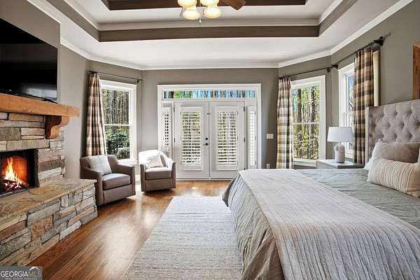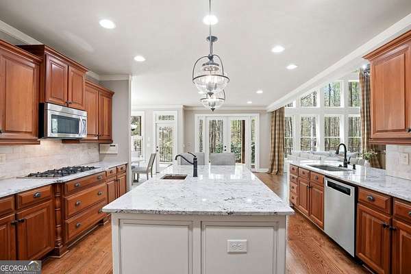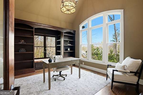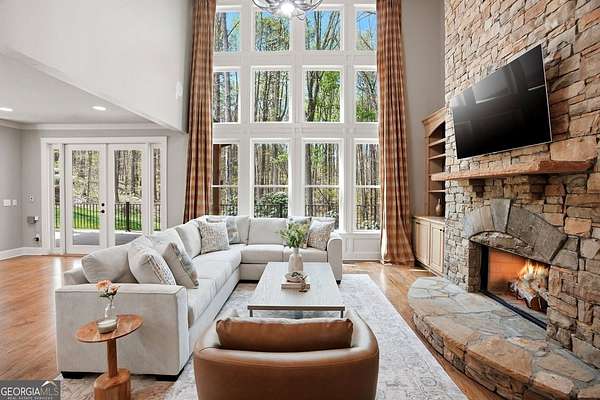 Set on 1.96 private, wooded acres, this 6 bedroom, 4.5 bathroom estate home offers nearly 6,000 square feet of finished living space, a 3-car garage, and a finished terrace level in the sought after Estates at Brooke Park community. Residents enjoy more than 30 acres of amenities including a pool, tennis and pickleball courts, playground, sports field, and a riverwalk trail to the Etowah River, all just minutes to Northside Cherokee Hospital, I 575, Downtown Historic Canton, shopping and dining. The home features a bright, open layout with a two-story great room anchored by a floor to ceiling stone fireplace and a wall of windows overlooking the private backyard. The kitchen was refinished in 2020 and offers a large island, updated counters, and a spacious breakfast area that flows easily into the main living space. A separate dining room and dedicated office with custom built-ins add both function and flexibility. The primary suite includes its own fireplace, sitting area, and access to the private yet expansive porch, along with a bathroom featuring a soaking tub, separate shower, dual vanities, and a custom walk-in closet. Secondary bedrooms are generously sized, and the home includes two laundry hookups with options for gas and electric on the main level. Outdoor living is a highlight with a massive Trex deck, fire pit, chicken coop, garden areas with peach trees, asparagus, and blueberries, plus a fenced dog run and invisible fence. The property also borders additional wooded land that cannot be developed, enhancing long-term privacy. Additional features include a fully finished basement terrace level with kitchenette, central vacuum, Rachio smart irrigation, EV charger with a dedicated 50 amp breaker, epoxy garage floors, garage emergency sprinkler system, smart thermostats, and a full security system with cameras and driveway notification. A rare combination of space, privacy, and community amenities in a PRIME convenient Canton location. Zoned for Creekview High School.
