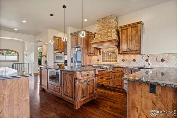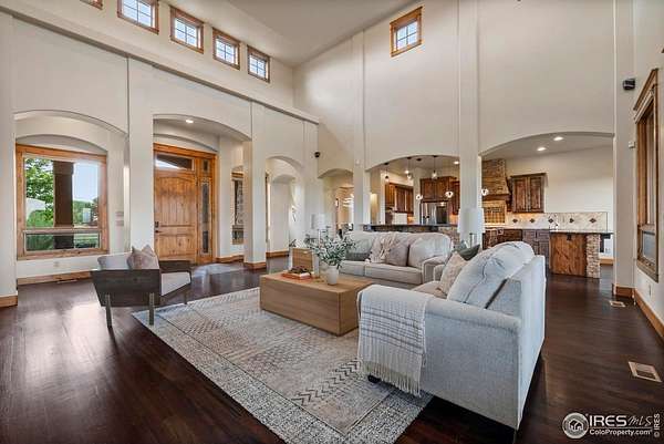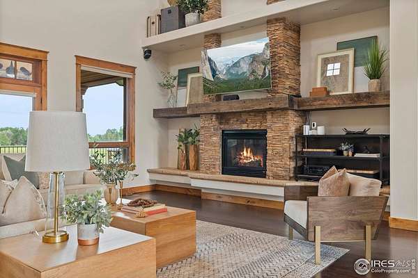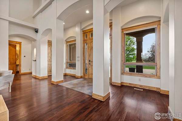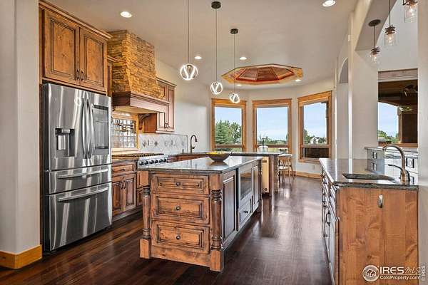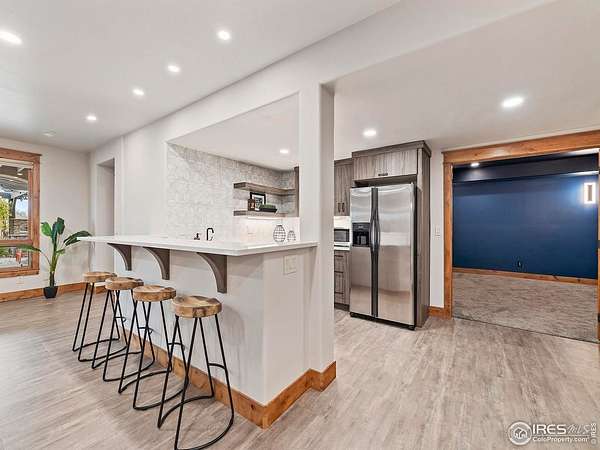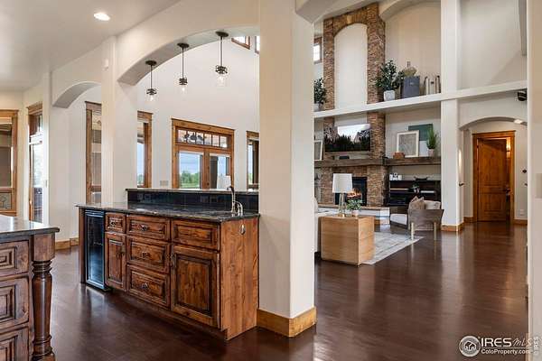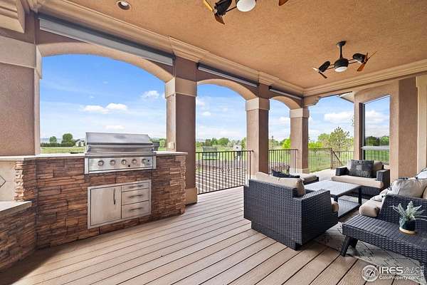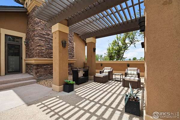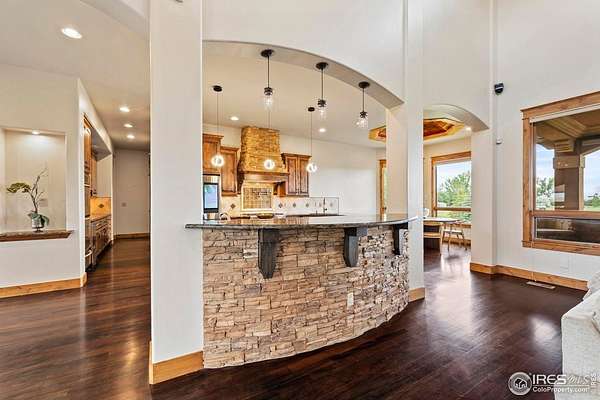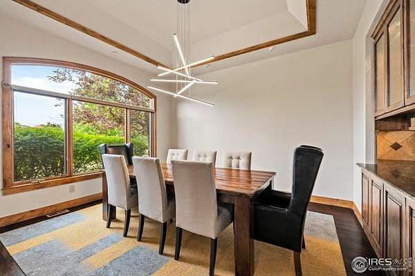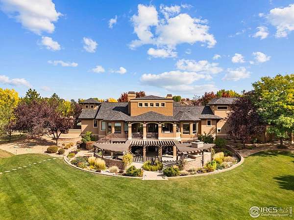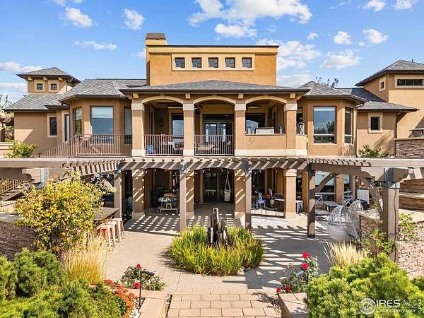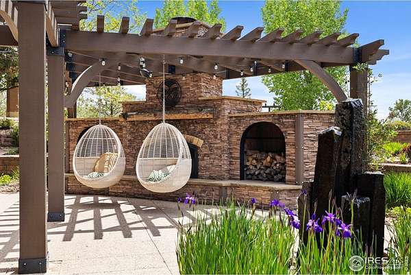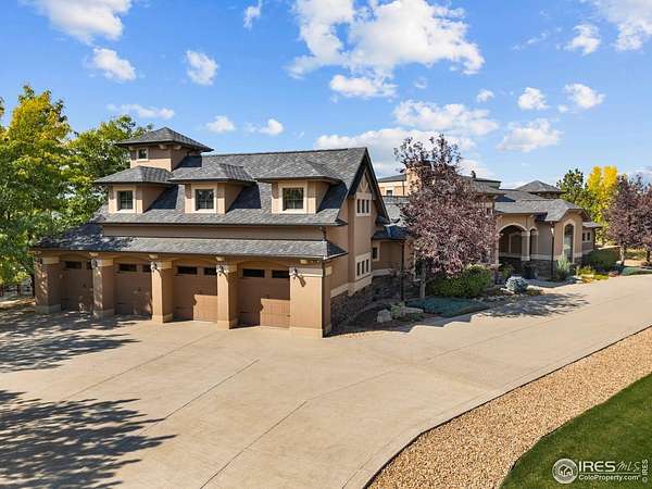 This luxury home at 863 Riparian Way in Fort Collins is a modern masterpiece. The gourmet kitchen includes granite countertops, a spacious island, and premium appliances: six-burner Viking range, double oven, wine fridge, ice maker, Samsung Smart Refrigerator, and pot filler. With under-cabinet lighting and a large walk-in pantry, breakfast nook with a custom wood-lined ceiling and bay window offers panoramic foothill views. The formal dining room has a 12' coffered ceiling, designer lighting, and a pass-through buffet perfect for entertaining. In the great room, 23' ceilings, hand-troweled walls, and a stone fireplace framed by reclaimed wood shelves create a stunning focal point. The primary suite features a gas fireplace, coffee bar, walk-in closet, bathroom with steam shower, heated floors, and access to a private patio wired for a hot tub. The main floor study doubles as a fifth bedroom with vaulted ceilings, built-in cabinetry, and an adjacent 3/4 bath. Upstairs, the ensuite has a gas fireplace, wet bar, vaulted ceilings, and 3/4 bath. Secondary bedrooms have new carpet (2022), walk-in closets, and remodeled ensuites with custom cabinets and designer fixtures. The remodeled basement (2022) includes a wet bar with quartz counters, luxury vinyl flooring, a wine cellar with copper ceiling, a theater room with projector, and ample storage. A stone gas fireplace and built-in shelving add warmth to the game room. From coffered ceilings to high-end finishes, this home showcases impeccable craftsmanship. Enjoy Colorado foothill views from the upper Trex deck with a built-in grill, heaters, sun shades, and fans. The walkout lower level has a wood-burning fireplace, water feature, and outdoor kitchen with grill, mini fridge, sink, granite island, and beverage sink. An aggregate patio leads to a garden, horseshoe pit, and fire pit. This property backs to HOA open space, with forever views and a temperature-controlled 4-car garage with electric car charger hookups.