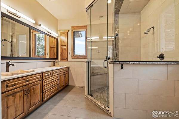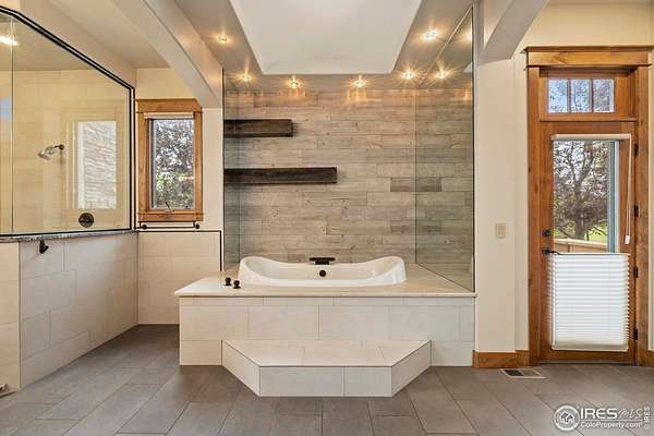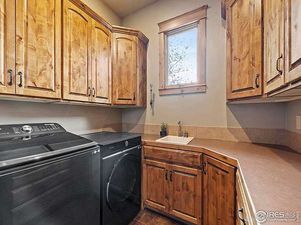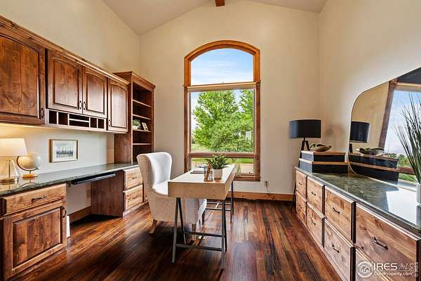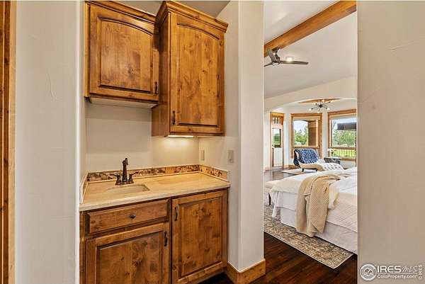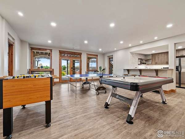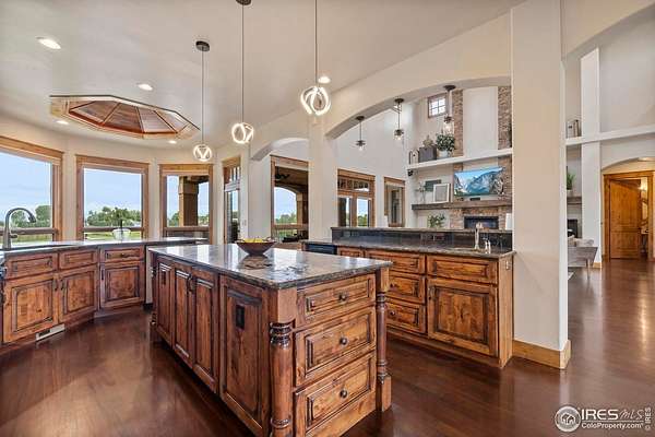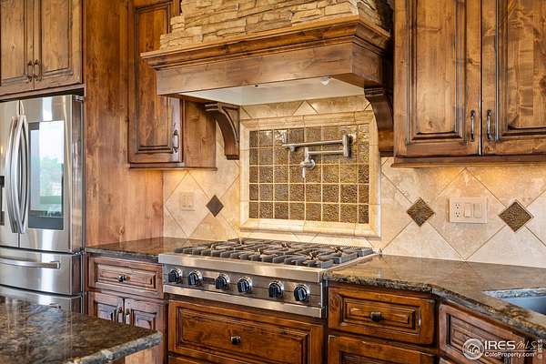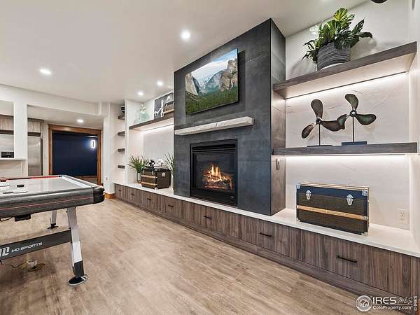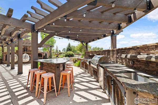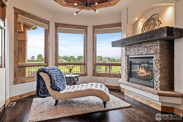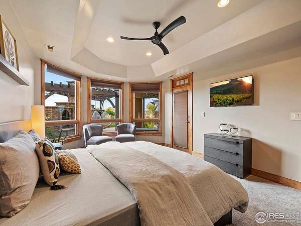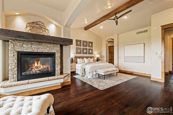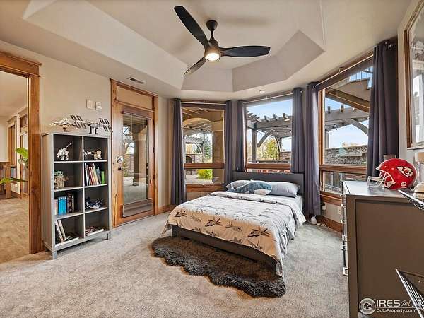 This luxury home at 863 Riparian Way in Fort Collins is a modern masterpiece. The gourmet kitchen includes granite countertops, a spacious island, and premium appliances: six-burner Viking range, double oven, wine fridge, ice maker, Samsung Smart Refrigerator, and pot filler. With under-cabinet lighting and a large walk-in pantry, breakfast nook with a custom wood-lined ceiling and bay window offers panoramic foothill views. The formal dining room has a 12' coffered ceiling, designer lighting, and a pass-through buffet perfect for entertaining. In the great room, 23' ceilings, hand-troweled walls, and a stone fireplace framed by reclaimed wood shelves create a stunning focal point. The primary suite features a gas fireplace, coffee bar, walk-in closet, bathroom with steam shower, heated floors, and access to a private patio wired for a hot tub. The main floor study doubles as a fifth bedroom with vaulted ceilings, built-in cabinetry, and an adjacent 3/4 bath. Upstairs, the ensuite has a gas fireplace, wet bar, vaulted ceilings, and 3/4 bath. Secondary bedrooms have new carpet (2022), walk-in closets, and remodeled ensuites with custom cabinets and designer fixtures. The remodeled basement (2022) includes a wet bar with quartz counters, luxury vinyl flooring, a wine cellar with copper ceiling, a theater room with projector, and ample storage. A stone gas fireplace and built-in shelving add warmth to the game room. From coffered ceilings to high-end finishes, this home showcases impeccable craftsmanship. Enjoy Colorado foothill views from the upper Trex deck with a built-in grill, heaters, sun shades, and fans. The walkout lower level has a wood-burning fireplace, water feature, and outdoor kitchen with grill, mini fridge, sink, granite island, and beverage sink. An aggregate patio leads to a garden, horseshoe pit, and fire pit. This property backs to HOA open space, with forever views and a temperature-controlled 4-car garage with electric car charger hookups.