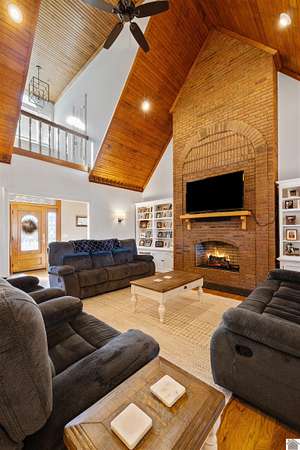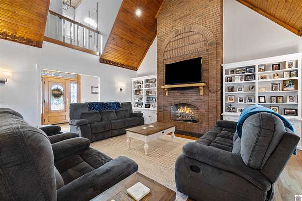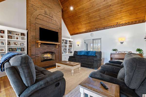 This high-end, custom, and spacious brick home on 11.6 Acres in the southern portion of Calloway Co is a MUST SEE! Beautiful 4 bdrm, 3 full bath brick home situated on 11.6 picturesque acres in Calloway Co. A paved circular drive, and an inviting Jack Wallis front door brings you inside, where you'll find generous living spaces including upstairs sitting/play areas, perfect for family living, entertaining, or relaxing. Gorgeous custom solid oak spiral staircase. Stainless appliances, granite in kitchen, gas logs in the living room, as well as an all-season room off LR. This home features new TOP OF THE LINE Andersen windows, roof replaced Jan 2022, and an apt over garage, ideal for guests, extended family, or potential rental income. Outside, enjoy a fenced-in backyard, plenty of open land, and a 40'x60' steel frame heated shop with water and electric for hobbies, storage, or equipment. This property offers the perfect blend of space, functionality, and country living--truly a must see!