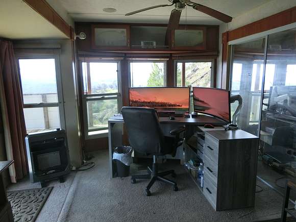 Bonus park model trailer, well situated, heavily upgraded (jeld-wen windows, extra sliding glass door, skylights, etc), with large roof built above and beautiful views from wrap-around deck. Electric is centralized and comes from the house with underground wires, but there is a transfer switch which can easily draw from a separate electrical source such as a generator or separate solar array with the flip of a switch. Propane draws from the same large tanks. There are water pipes underground from the 5000 gallon water tank which feeds the house, connected to a 2" outlet near the trailer which can be used as a fire hydrant, as well as plumbing directly into the trailer, but for the sake of having gravity pressure the trailer is supplied by a dedicated 2000 gallon water tank positioned slightly higher up.