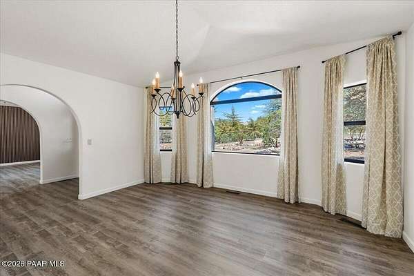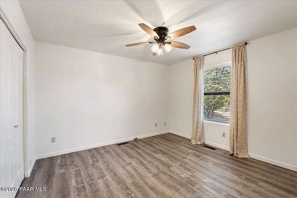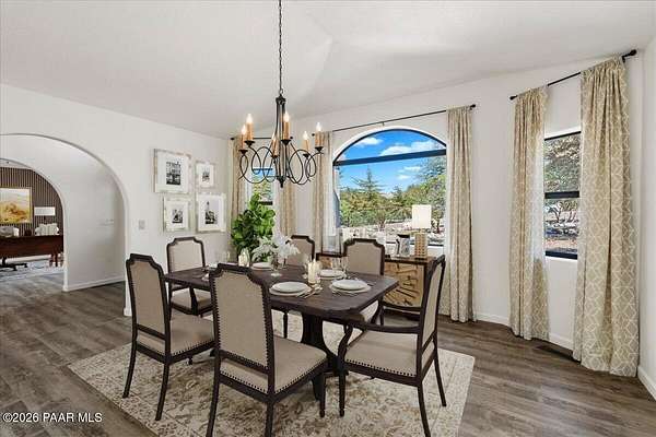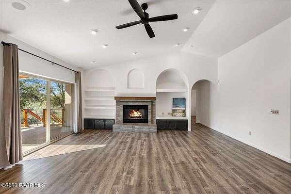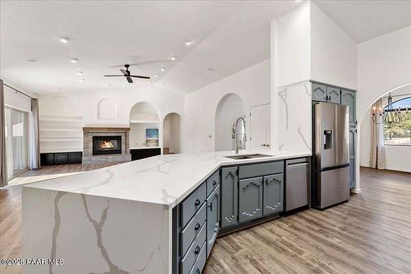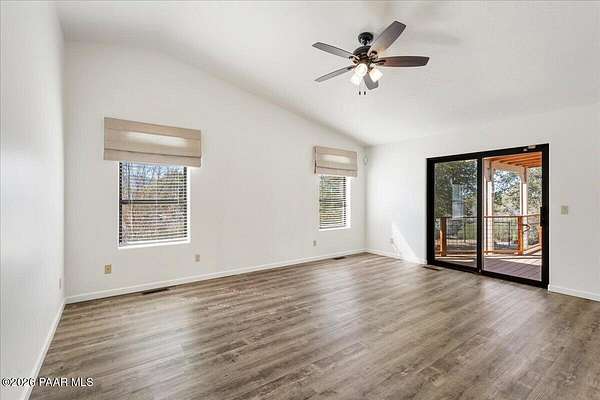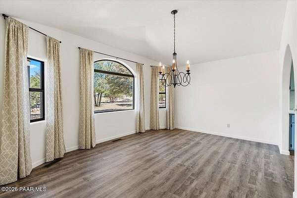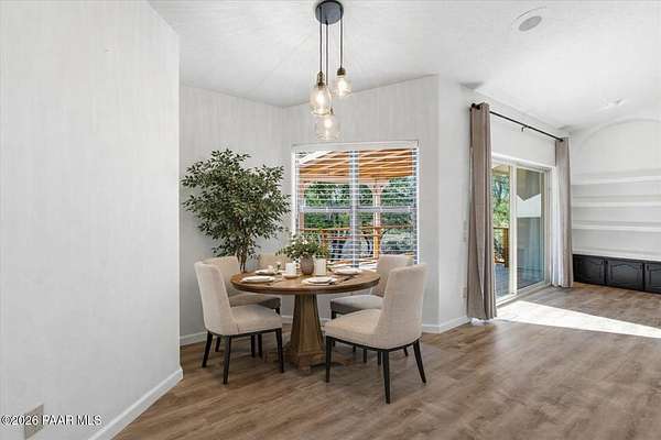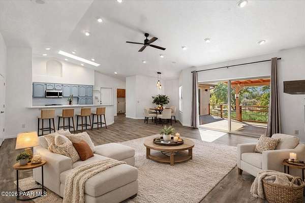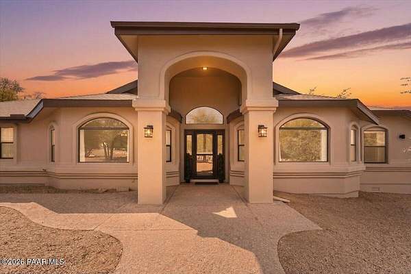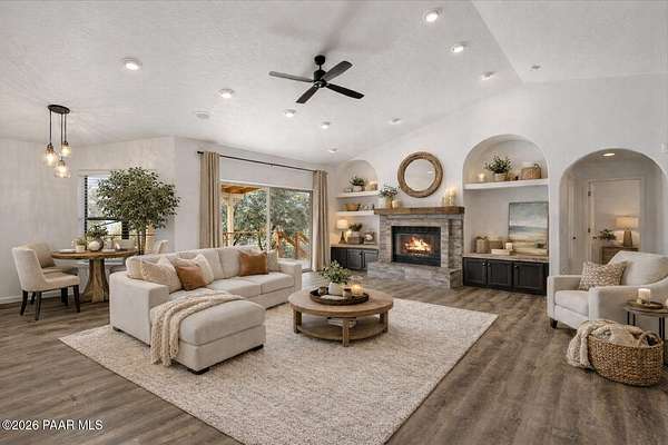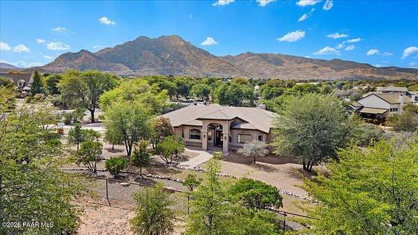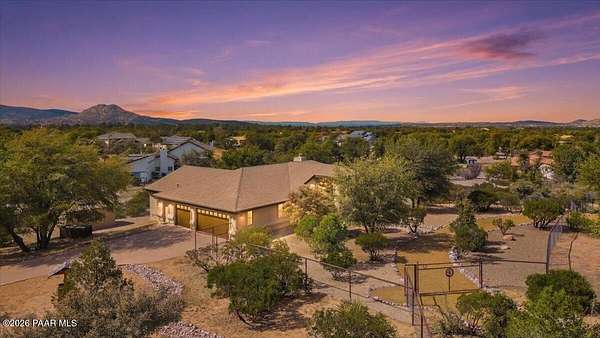 Granite Mountain views right in your own private oasis create the perfect backdrop for this beautifully updated home with land to grow your way, easy place to build your RV garage, guest house, or workshop. Designed for effortless one-level living, and no HOA! The thoughtfully designed layout offers seamless flow between the kitchen, living, and dining areas, along with a formal dining space and a flex room. The heart of the home is the stylish kitchen featuring quartz countertops, a striking backsplash, updated appliances, and a new refrigerator. The inviting living room centers around a gas or wood-burning fireplace, complemented by durable luxury vinyl flooring and a built-in surround sound system that enhances the home's warm and welcoming feel. The spacious primary suite provides a peaceful retreat with a jetted soaking tub, double vanity, and walk-in closet. Every detail reflects comfort and functionality while maintaining an elegant yet comfortable look. Step outside to enjoy the covered deck overlooking a shaded backyard with mature trees, a small grass area, and stunning Granite Mountain views. The fully landscaped grounds include four cross-fenced sections, offering versatility for animals, outdoor hobbies, or simply enjoying wide-open space and privacy. Additional highlights include a 3-car garage with an impressive 21.5-foot depth, an extra-large utility sink in the garage, and a security system for added convenience and peace of mind. A rare opportunity to own a beautifully refreshed home that combines privacy, usable acreage, and iconic Prescott views with comfort and style.