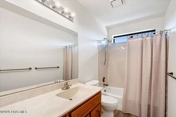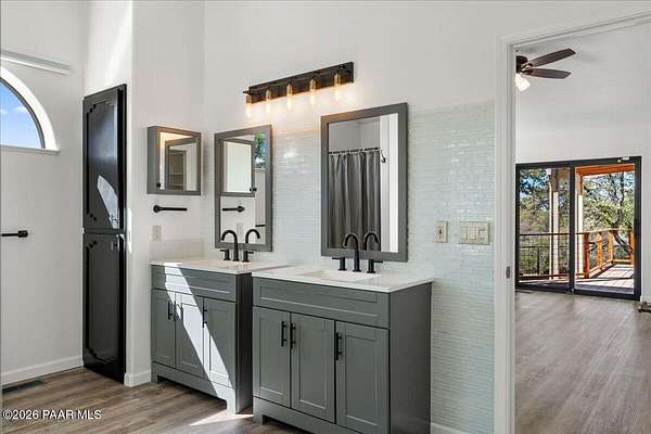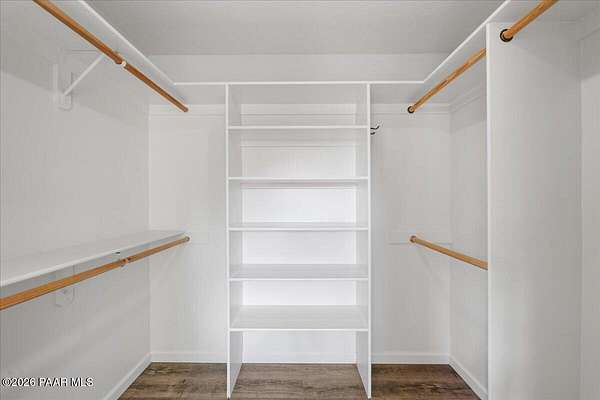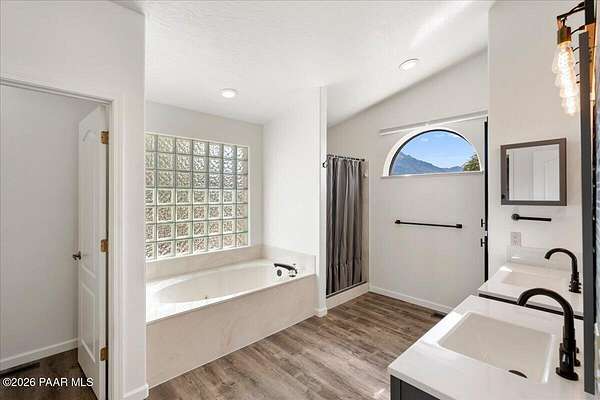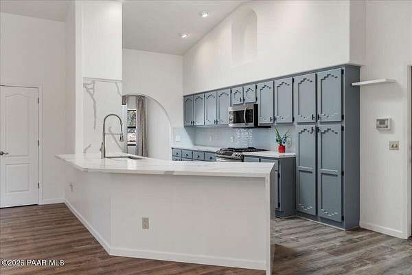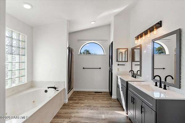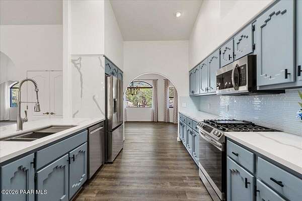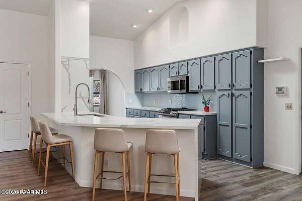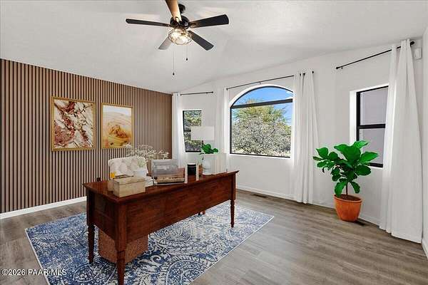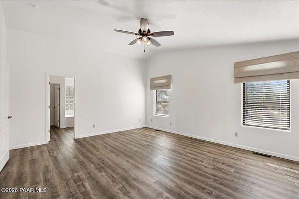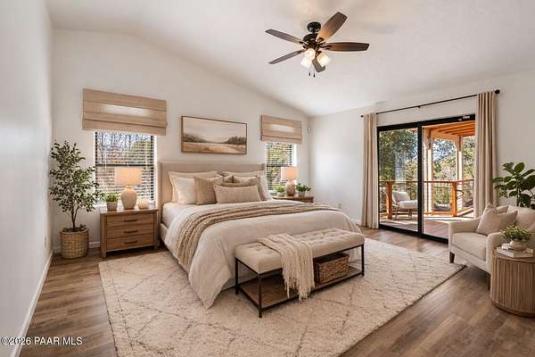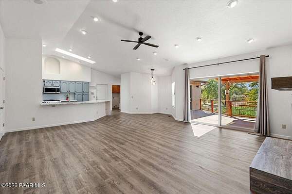 Granite Mountain views right in your own private oasis create the perfect backdrop for this beautifully updated home with land to grow your way, easy place to build your RV garage, guest house, or workshop. Designed for effortless one-level living, and no HOA! The thoughtfully designed layout offers seamless flow between the kitchen, living, and dining areas, along with a formal dining space and a flex room. The heart of the home is the stylish kitchen featuring quartz countertops, a striking backsplash, updated appliances, and a new refrigerator. The inviting living room centers around a gas or wood-burning fireplace, complemented by durable luxury vinyl flooring and a built-in surround sound system that enhances the home's warm and welcoming feel. The spacious primary suite provides a peaceful retreat with a jetted soaking tub, double vanity, and walk-in closet. Every detail reflects comfort and functionality while maintaining an elegant yet comfortable look. Step outside to enjoy the covered deck overlooking a shaded backyard with mature trees, a small grass area, and stunning Granite Mountain views. The fully landscaped grounds include four cross-fenced sections, offering versatility for animals, outdoor hobbies, or simply enjoying wide-open space and privacy. Additional highlights include a 3-car garage with an impressive 21.5-foot depth, an extra-large utility sink in the garage, and a security system for added convenience and peace of mind. A rare opportunity to own a beautifully refreshed home that combines privacy, usable acreage, and iconic Prescott views with comfort and style.