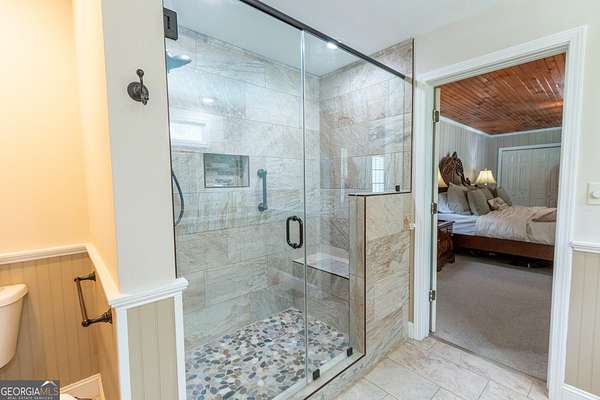 - Bookcases, Double Vanity, High Ceilings, Master On Main Level, Split Bedroom Plan, Tile Bath