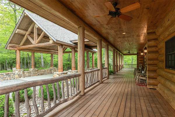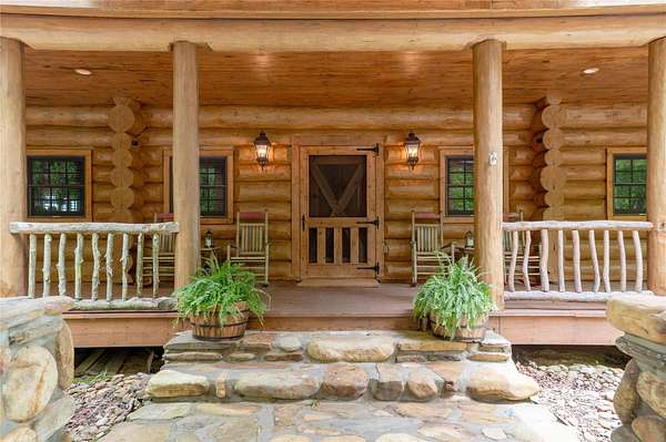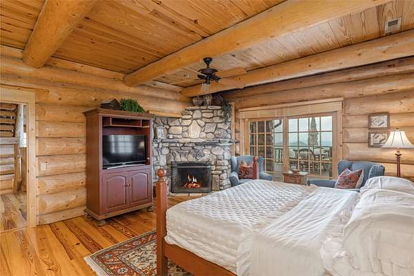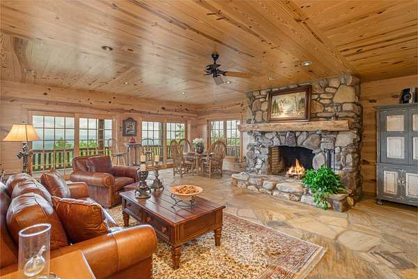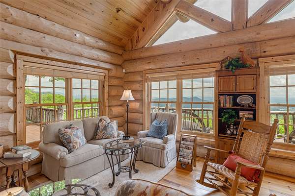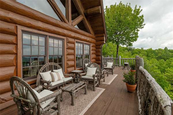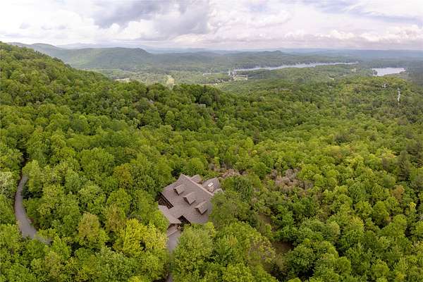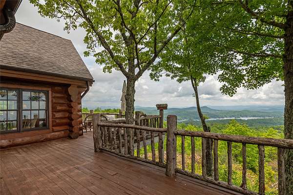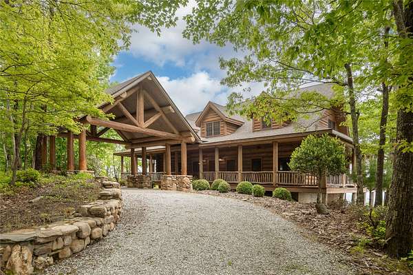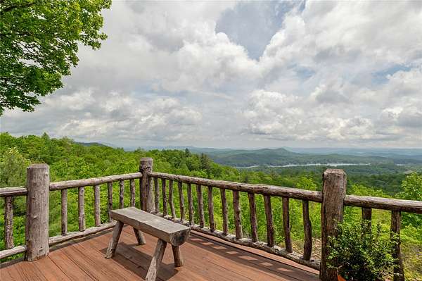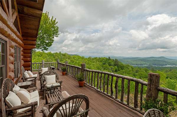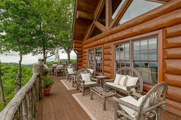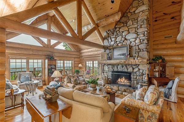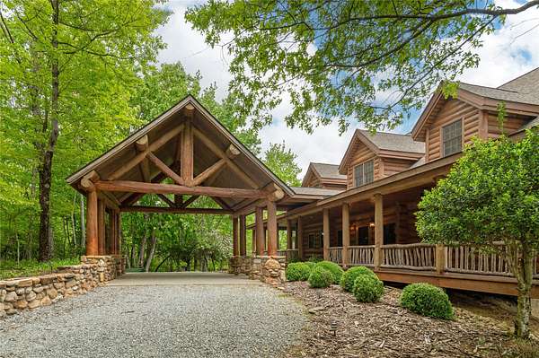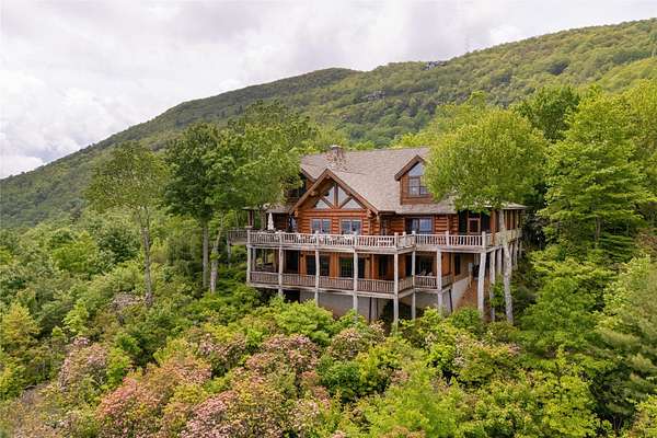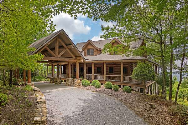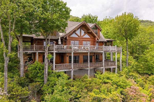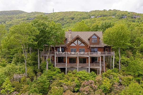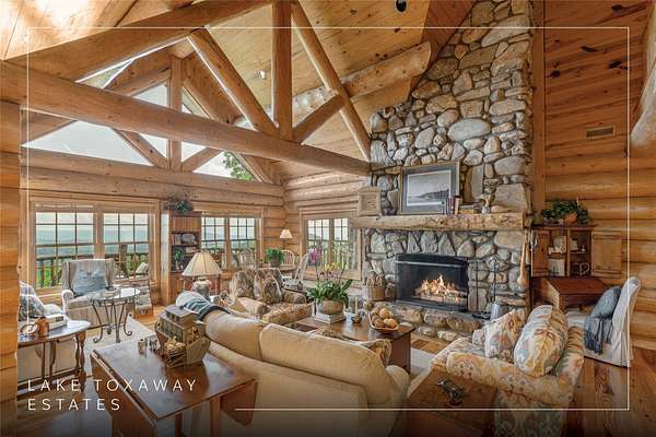 Perched atop over 12 secluded acres, this majestic log cabin estate is a rare and timeless offering - a legacy property where generations have gathered to celebrate life, love, and the breathtaking beauty of the Blue Ridge Mountains and Lake Toxaway. Every room, beam, and view tells a story. Thoughtfully crafted with intention and care, the home features five spacious ensuite bedrooms, each oriented to capture stunning vistas. The main-level primary suite is a serene retreat, complete with an impressive stone fireplace and direct access to outdoor tranquility. The main and lower-level living areas feature impressive wood-burning stone fireplaces and are framed by walls of windows that flood the interior with natural light, showcasing the expansive views. A spacious upstairs loft offers a quiet sitting area, while the lower level includes a flex room and workshop for hobbies or additional living space. At the heart of the home is a chef's dream kitchen featuring a Sub-Zero refrigerator, a Viking gas range, a Bosch dishwasher, and a large prep island. The kitchen seamlessly connects to the adjacent dining area, powder room, and laundry room. Ideal for entertaining guests or hosting intimate family gatherings, this home was designed for making memories. Outside, a private driveway leads through a laurel gate and over a picturesque bridge to a cascading waterfall. Multiple oversized decks, a screened-in sunroom, and a generous carport leading to a covered front porch offer abundant outdoor living space to enjoy the crisp mountain air and gaze at the mountains and moonrises. This remarkable estate, now being offered for the first time, is impeccably maintained, partially furnished, and offers enduring hardwood and large stone flooring, oversized bathrooms, and quality craftsmanship throughout. Located within the sought-after Lake Toxaway Estates community and just under an hour from Asheville Regional Airport, this home is ideally situated to enjoy the nearby mountain communities of Brevard, Sapphire, Cashiers, and Highlands. More than a home, this is a rare opportunity to create a legacy in one of Western North Carolina's most treasured settings.