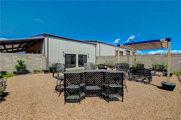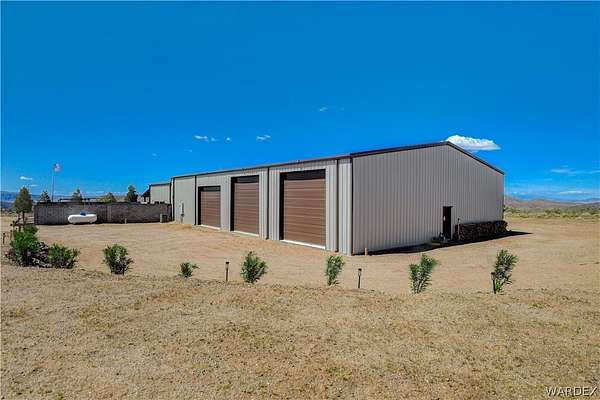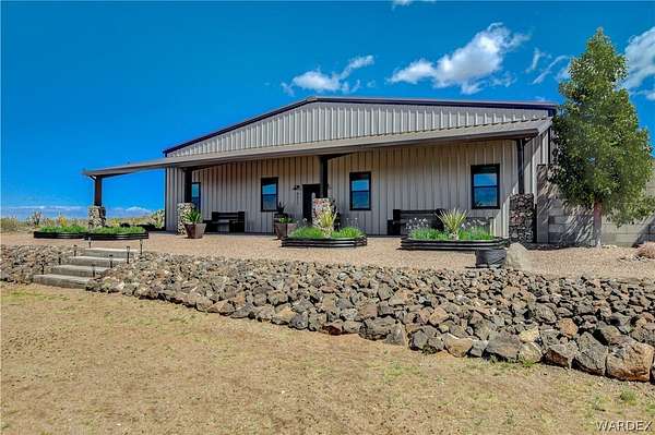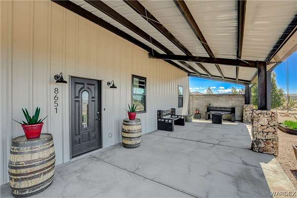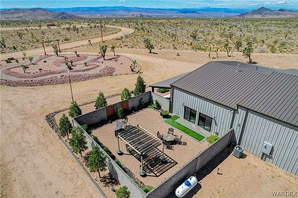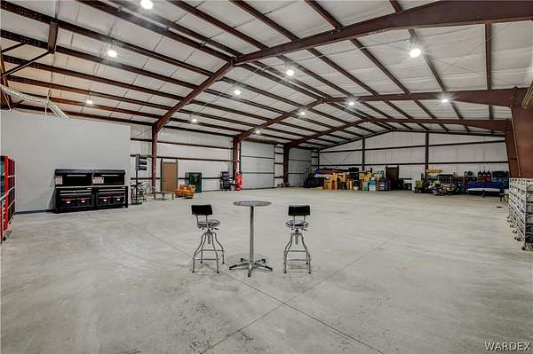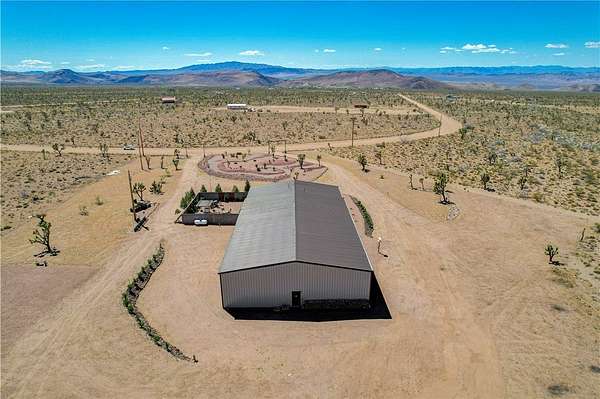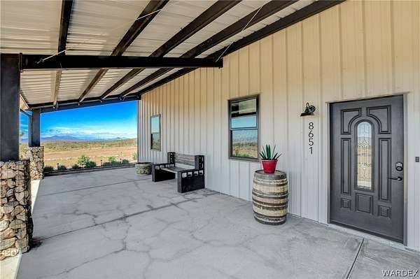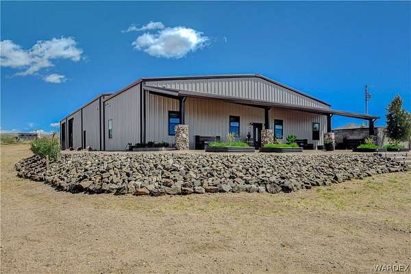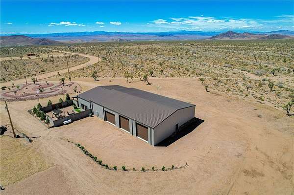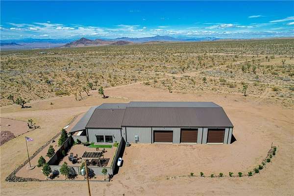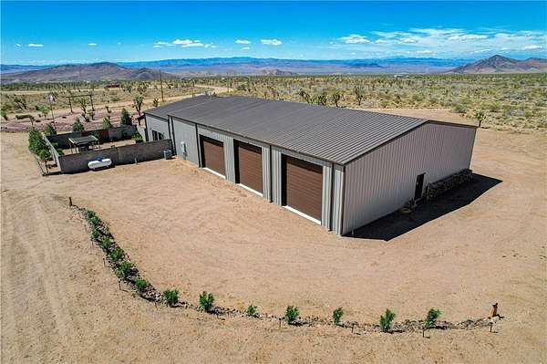 Come experience the tranquility of the desert and everything that this 2023, 7208 SQ FT, STEEL FRAMED BARDOMINIUM has to offer. A 2,047 sq ft home and 5,161 sq ft garage/shop, situated on 5.20 usable acres. This is a rare combination of residential living and large - scale shop infrastructure. The home also features an 840 sq ft front covered porch with beautiful features and a 1800 sq ft block wall surrounding a gorgeous yard, perfect for entertaining. Property is designed with a desert landscape a drip and irrigation system and an underground water drainage system leading to natural riverbeds. Home Features: 3 bedrooms, 2 baths, large mud/laundry room with maximum storage. Open concept with 10 ft ceilings throughout the home. Fireplace in living room for those sometimes chilly desert evenings. Gorgeous kitchen with large island, farm sink and plenty of storage space. Primary suite is spacious and features a full wet room style bathroom with beautiful soaking tub and oversized shower. Guest bedrooms are large and airy. Home has energy efficient double pane windows and sliding doors. Shop Features: 21ft peak height, 1-14x16 electric door and 4-12x16 manual doors. 400 amp service, 3-phase power, EV charging rough in, and 1 indoor RV hook up. 2 more RV hook ups are outside on property. Shop has drive through design. This home and property was designed for comfort, easy living, space to do what you love to do and space to put all the toys up at the end of the day! Come enjoy all that the desert has to offer! Call for your appointment today.