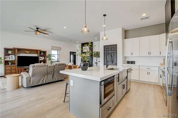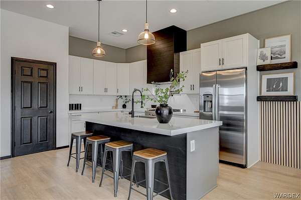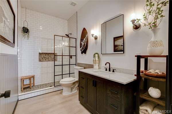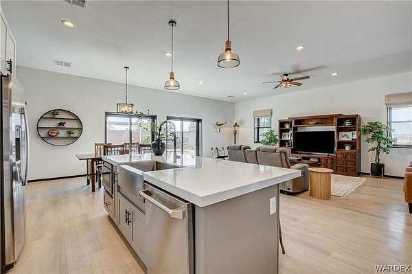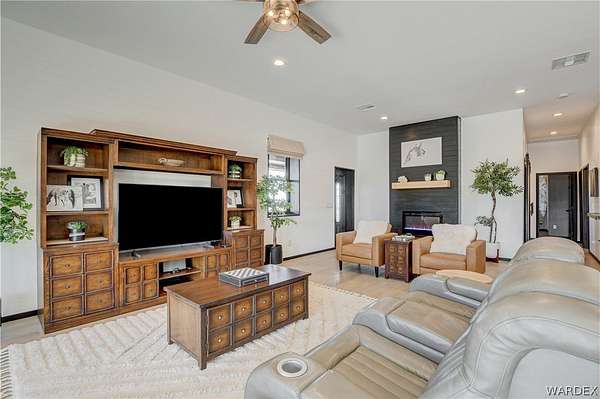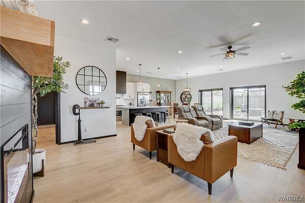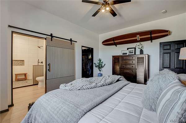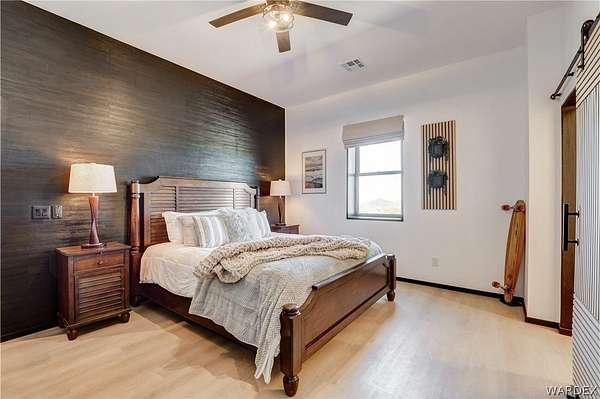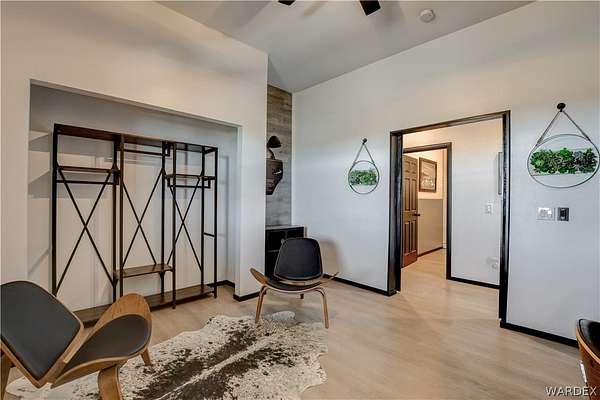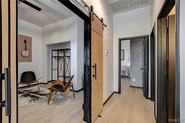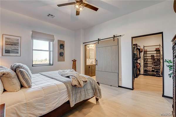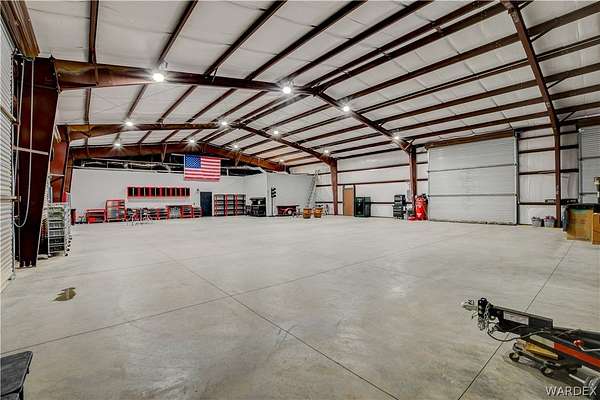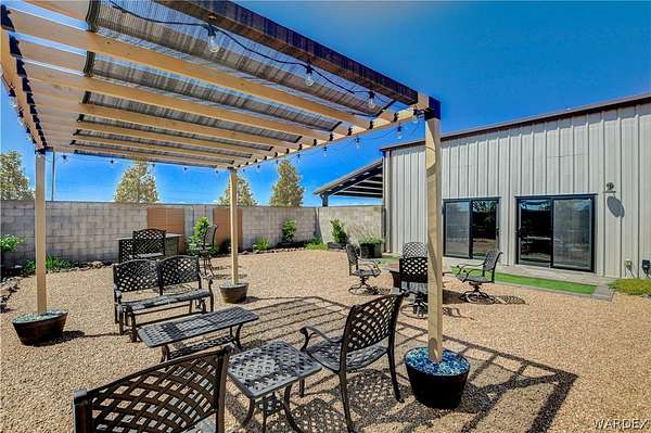 Come experience the tranquility of the desert and everything that this 2023, 7208 SQ FT, STEEL FRAMED BARDOMINIUM has to offer. A 2,047 sq ft home and 5,161 sq ft garage/shop, situated on 5.20 usable acres. This is a rare combination of residential living and large - scale shop infrastructure. The home also features an 840 sq ft front covered porch with beautiful features and a 1800 sq ft block wall surrounding a gorgeous yard, perfect for entertaining. Property is designed with a desert landscape a drip and irrigation system and an underground water drainage system leading to natural riverbeds. Home Features: 3 bedrooms, 2 baths, large mud/laundry room with maximum storage. Open concept with 10 ft ceilings throughout the home. Fireplace in living room for those sometimes chilly desert evenings. Gorgeous kitchen with large island, farm sink and plenty of storage space. Primary suite is spacious and features a full wet room style bathroom with beautiful soaking tub and oversized shower. Guest bedrooms are large and airy. Home has energy efficient double pane windows and sliding doors. Shop Features: 21ft peak height, 1-14x16 electric door and 4-12x16 manual doors. 400 amp service, 3-phase power, EV charging rough in, and 1 indoor RV hook up. 2 more RV hook ups are outside on property. Shop has drive through design. This home and property was designed for comfort, easy living, space to do what you love to do and space to put all the toys up at the end of the day! Come enjoy all that the desert has to offer! Call for your appointment today.