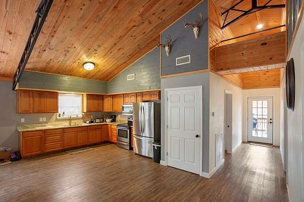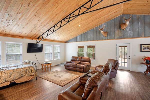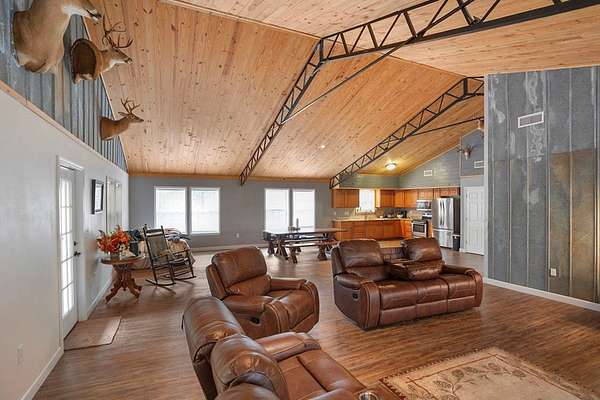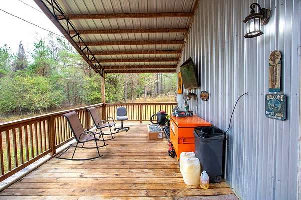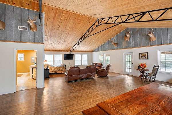 Discover the perfect blend of comfort, privacy, and outdoor recreation with this 2 bedroom, 1 bath open-floorplan barndominium. Step inside to soaring high ceilings, a spacious living area, and a layout ideal for families, weekend stays, or hunter groups needing plenty of room to unwind. Relax on the inviting front porch, the perfect spot for rocking chairs as you enjoy peaceful views all the way down the long gated driveway. Out back, a generous entertaining deck offers space for grilling, game night, and gathering after a successful hunt. Situated in an area known for abundant deer traffic, this property is a dream for outdoorsmen looking for a ready-to-enjoy retreat. Whether used as a personal hunting lodge, weekend getaway, or income-producing property, the opportunities are endless. Well & Septic. Don't miss your chance to own a hunter-approved barndominium with comfort, privacy, and wildlife right at your doorstep!