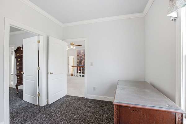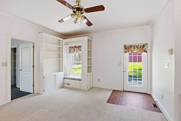 Inside, the residence reveals a level of artistry that has become lost. You are greeted by stately columns flanking the entry, elegant crown molding, and a warm wood-burning fireplace. The heart of the home is defined by extensive custom cabinetry, a hallmark of quality that begins in the kitchen and continues through every bathroom and living space. Designed for effortless living, the two-car garage and breezeway lead directly into the kitchen, while the main-level primary suite serves as a true escape with dual walk-in closets and a sun-drenched private sunroom.