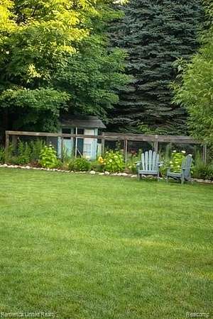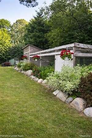 The exterior showcases extensive landscaping, a fenced garden area, and dedicated chicken, duck, and peacock coops—perfect for homestead or hobby farm opportunities. The walkout design provides abundant natural light and seamless access to the beautifully maintained outdoor spaces.