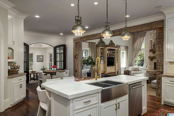 This exquisitely spacious custom-build with enchanting character has 5 bedrooms, 6 full baths, 3 half baths, primely nestled in a peaceful cul-de-sac in Indian Springs. A manicured estate 3+/- acre lot w/lovely landscaping frames this beautiful brick & stone home. The grand foyer w/striking stairway welcomes you into an open floor plan for everyday living & idyllic entertaining. 5" Hickory Hardwoods, Hand Hewn Antique Oak beams, stone & brick interior walls,5 interior fireplaces & custom millwork highlight timeless style. Spacious eat-in kitchen w/marble counters, Chef-grade appliances, 3 ovens & more. Primary suite w/sitting area, FP, dual marble vanities, soaking tub, shower & 2 closets. Upstairs: 4 bedroom suites w/marble counters. LOWER:10 ft ceilings, wine cellar, kitchen, den, exercise, movie & craft rm. 5 garages. Veranda, covered porches, FP, garden, playyard, & heated saltwater pool make for a picturesque setting to call home. One of a kind property - schedule a private tour!