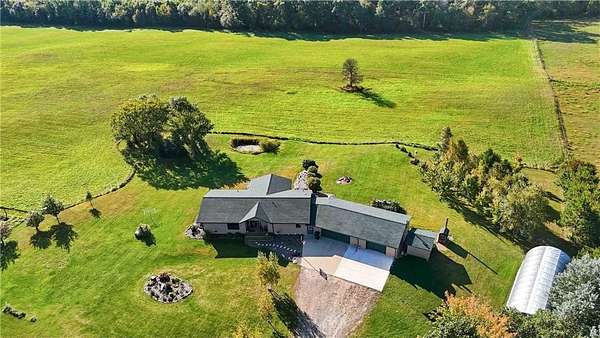 Who says you can't have it all! Enjoy room to roam on 16 acres just minutes from town. This 3300 sq ft home features 4 bedrooms, 3 baths, a 3 car attached garage including one stall with infloor heat, a detached 1 car garage and large carport for all the toys. Property is filled with apple trees, rhubarb, blueberries, rasberries, lots of perrenials, and deer stands. The appliances are less than 2 years old, the roof is 3 years old and this highly efficient home has a brand new Hvac system. The heating system can be used with propane, electric, or an outside wood boiler. Enjoy the infloor heat in the Huge lower level walkout family room. Lots of possibilities with a combination of woods and open area.