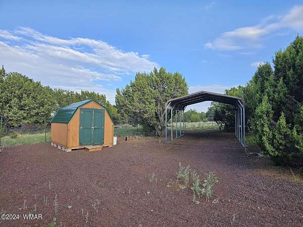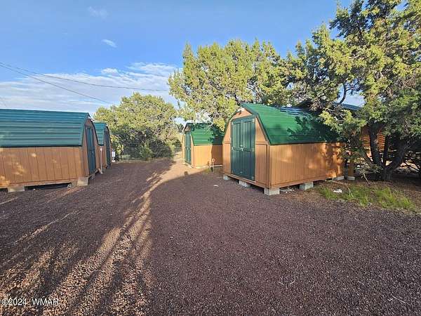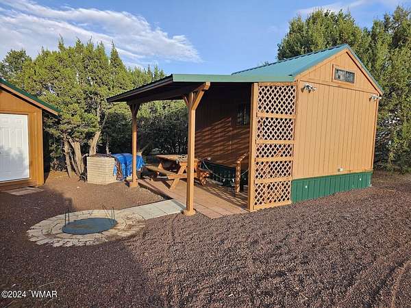 Escape the heat and embrace the four seasons of the White Mountains with this serene retreat. Nestled on a lush 1-acre parcel, this property offers everything you need for comfortable living and outdoor enjoyment. Upon arrival, you'll find a fully functional 5th wheel connected to a septic system, providing immediate housing convenience. Adjacent to the 5th wheel is a charming bunk house, equipped with laundry facilities, a full bathroom, a cozy loft area, and ample space for relaxation, including a comfortable couch. For culinary enthusiasts, a shed has been thoughtfully converted into a full kitchen, perfect for preparing meals with ease. Imagine cooking amidst the natural beauty of the surrounding landscape. Outdoor gatherings are a delight with multiple... amenities spread across the property. A firepit area invites evenings spent roasting marshmallows under the starlit sky. Nearby, a covered picnic area offers shade and a place for alfresco dining. Storage needs are well-met with covered parking options, ensuring ample space for vehicles and equipment. Additionally, five extra storage sheds provide plenty of room for tools, seasonal items, and recreational gear. Nature lovers will appreciate the property's lush surroundings, densely populated with mature trees that offer shade and privacy throughout the year. The entire parcel is fenced, providing security and a sense of seclusion. For those with green thumbs, a fenced-in garden area awaits, ready for planting and cultivating your favorite fruits, vegetables, and flowers. RV hookups and water spickets are conveniently located throughout the property, ensuring ease of access to utilities. Whether you seek a peaceful retreat, or a year-round residence enveloped in natural beauty, this property in Show Low Highlands promises a lifestyle enriched by its unique features and picturesque setting.