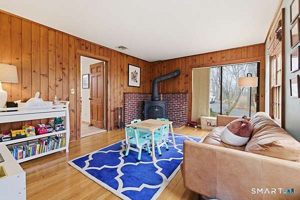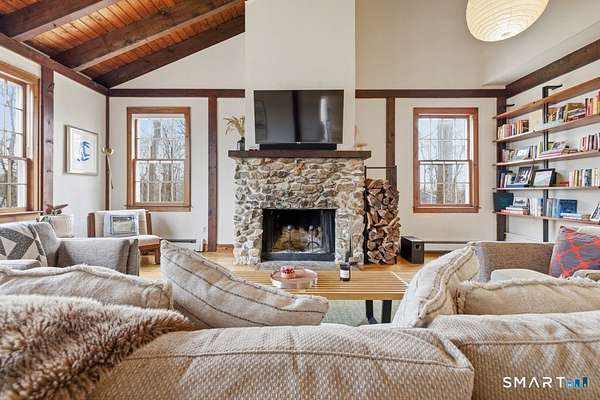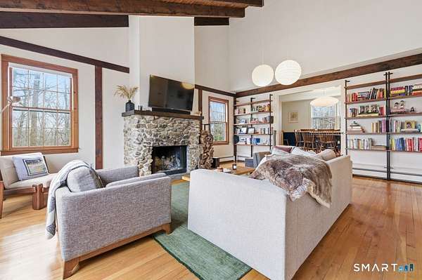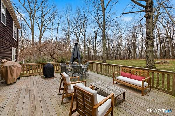 Welcome to this lovely 4-bedroom, 2.5-bath antique reproduction privately set on 1.5 parklike acres, minutes to Ridgefield's charming Main Street. Major improvements over the past five years ensure carefree enjoyment for years to come: new roof (2024), new furnace and hot water heater (2024-25), rebuilt deck, replaced sliding door, regraded and repaved driveway, replaced garage doors and well pump, plus new dishwasher, induction range, washer, and dryer. Simply move in. The inviting living room showcases a stunning stone fireplace and soaring vaulted ceilings, creating a light-filled gathering space perfect for family and friends. The cozy family room/den features a wood-burning stove, perfect for home office or play room. The thoughtful floor plan provides wonderful flow for both everyday living and entertaining. The private, level backyard is ideal for outdoor activities, gardening, or peaceful relaxation within a serene, parklike setting. Ample storage throughout, including two separate floored attics, offers excellent functionality. Optional lake rights to Lake Mamanasco provide access to a beach, swimming, kayaking-summer fun without leaving home! Ideally located minutes from Ridgefield's Main Street with exceptional dining, shopping, cultural offerings, and top-rated schools. Enjoy convenient commuting with easy access to Metro North trains in Westchester and both I-84 and 684 . Ridgefield, voted the Safest Town in CT, is the perfect place to call home!