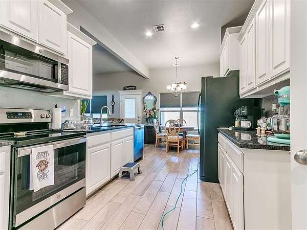 Set on approximately 3.67 acres, this property blends country charm with modern convenience. Inside, you will find beautiful wood look tile throughout the main living areas and carpet in the bedrooms. The open concept layout features a stunning kitchen with custom cabinetry, granite countertops, and stainless steel appliances, making it ideal for both entertaining and everyday living.