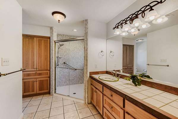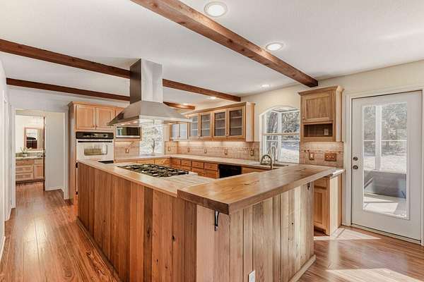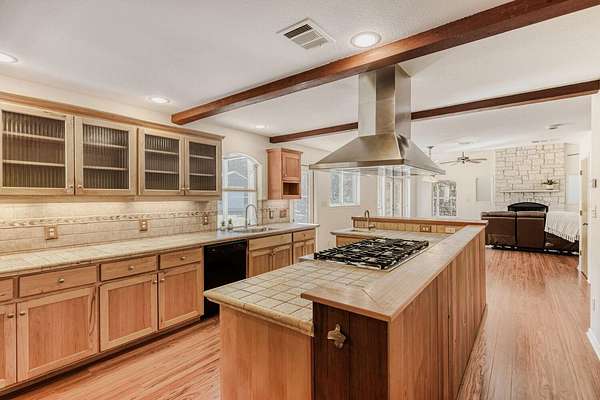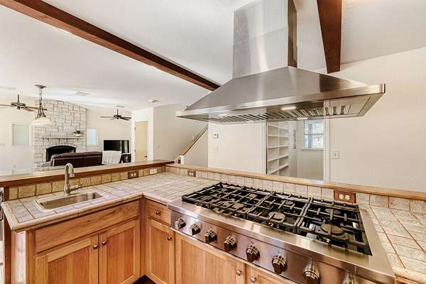 - Bar, Beamed Ceilings, Bookcases, Ceiling Fan(s), Ceiling-Vaulted, Kitchen Island, Natural Woodwork, Open Floorplan, Pantry, Recessed Lighting, Tile Counters, Two Primary Closets, Walk-In Closet(s)