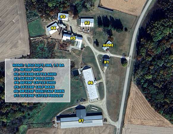 - 7 Outbuildings Incl. Heated Shop, Auto Feeders, Barn, Barns, Bins, Can Be Divided, Fans, Farm Equipment, Feedlot, Fencing, Fireplace, Garage, Horses Okay, Livestock Ok, Outbuildings, Pens, Wells & More.